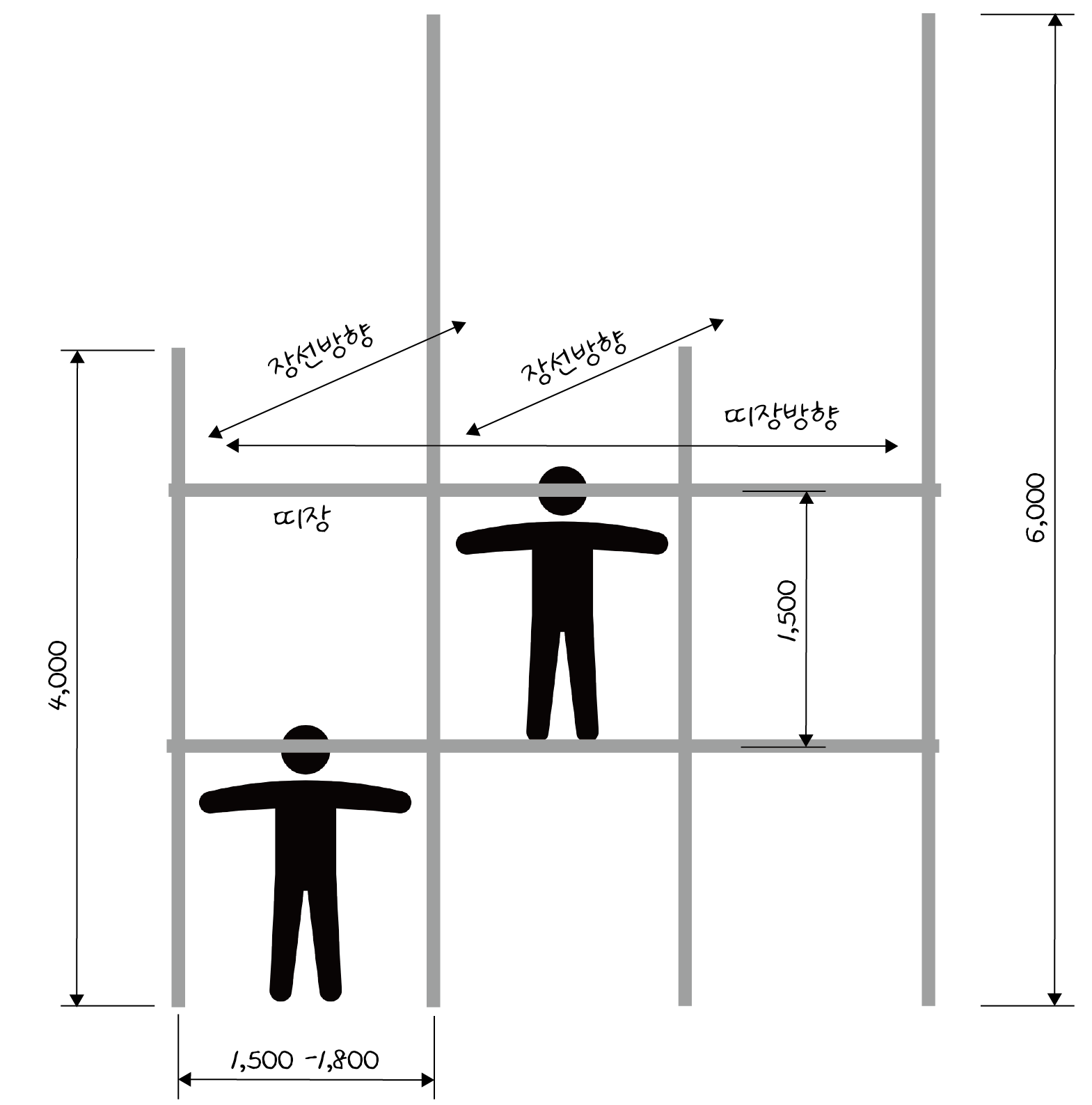 일단 강관 기둥은 4m나 6m짜리를 번갈아가면서 세우는데, 작업자가 양팔을 벌려서 간격을 잡습니다. 그러니까 대충 2m안쪽이 되는데, 기준에서도 띠장 방향으로 1.5 m 이상 1.8 m 이하로 규정되어 있습니다. 또한 한층 한층 띠장을 조립할 때도 눈높이 정도의 높이에서 수평을 잡습니다. 보통 성인 남자의 눈높이가 1.5 m 정도가 되니까 띠장의 간격도 그 정도가 된다고 생각합니다. 이 두 치수를 기준으로 설치기준을 암기하면 좋을 것 같습니다.