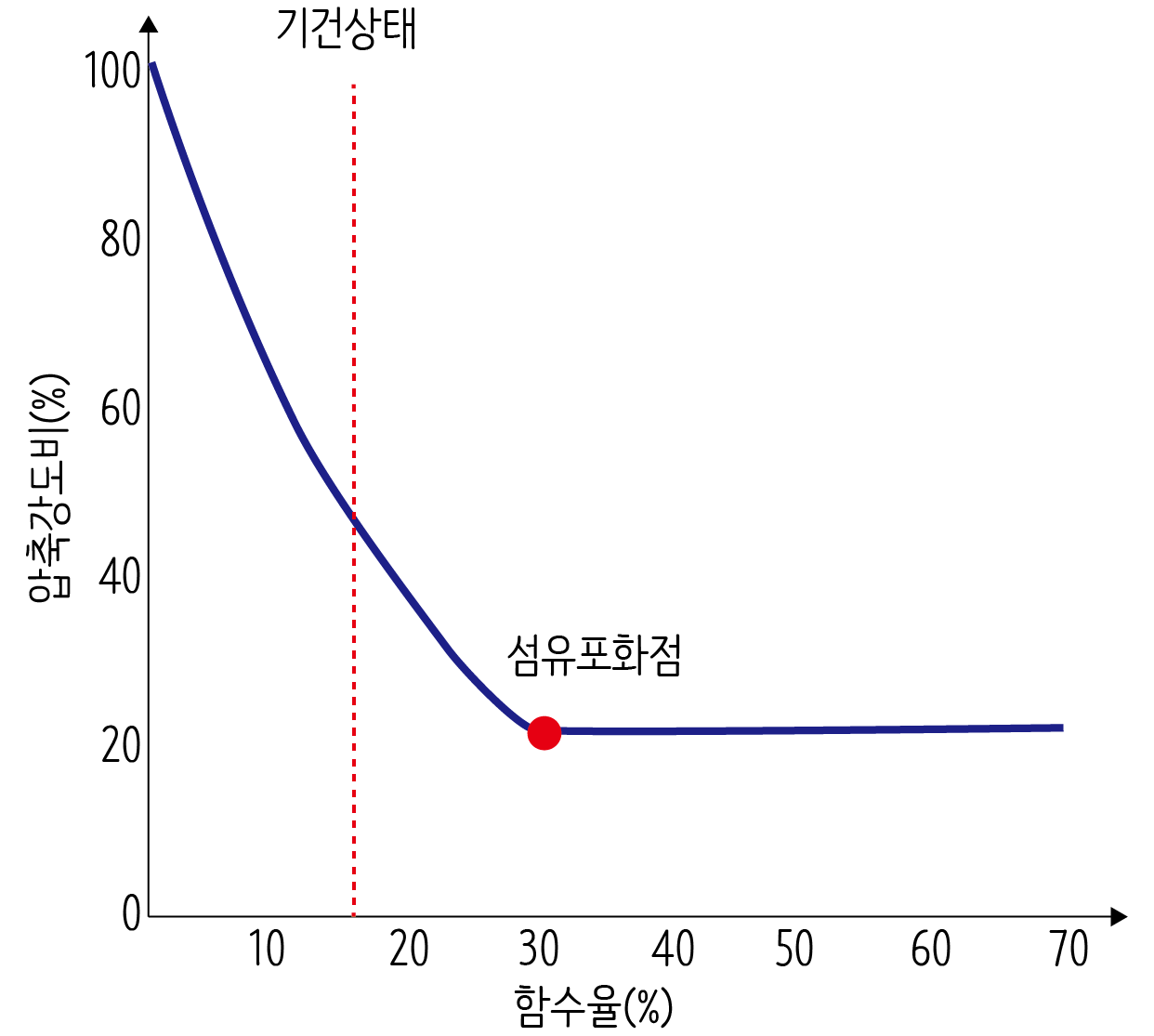목재에서 섬유포화점은 매우 특별한 성질을 갖습니다. 대체로 섬유포화점은 수종에 관계없이 30%로 일정합니다. 섬유포하점을 지나 계속 건조하게 되면 흡착수는 대기의 습도와 평행상태일 때까지 건조하게 되고 보통 기건재의 함수율은 약 15%을 나타냅니다.