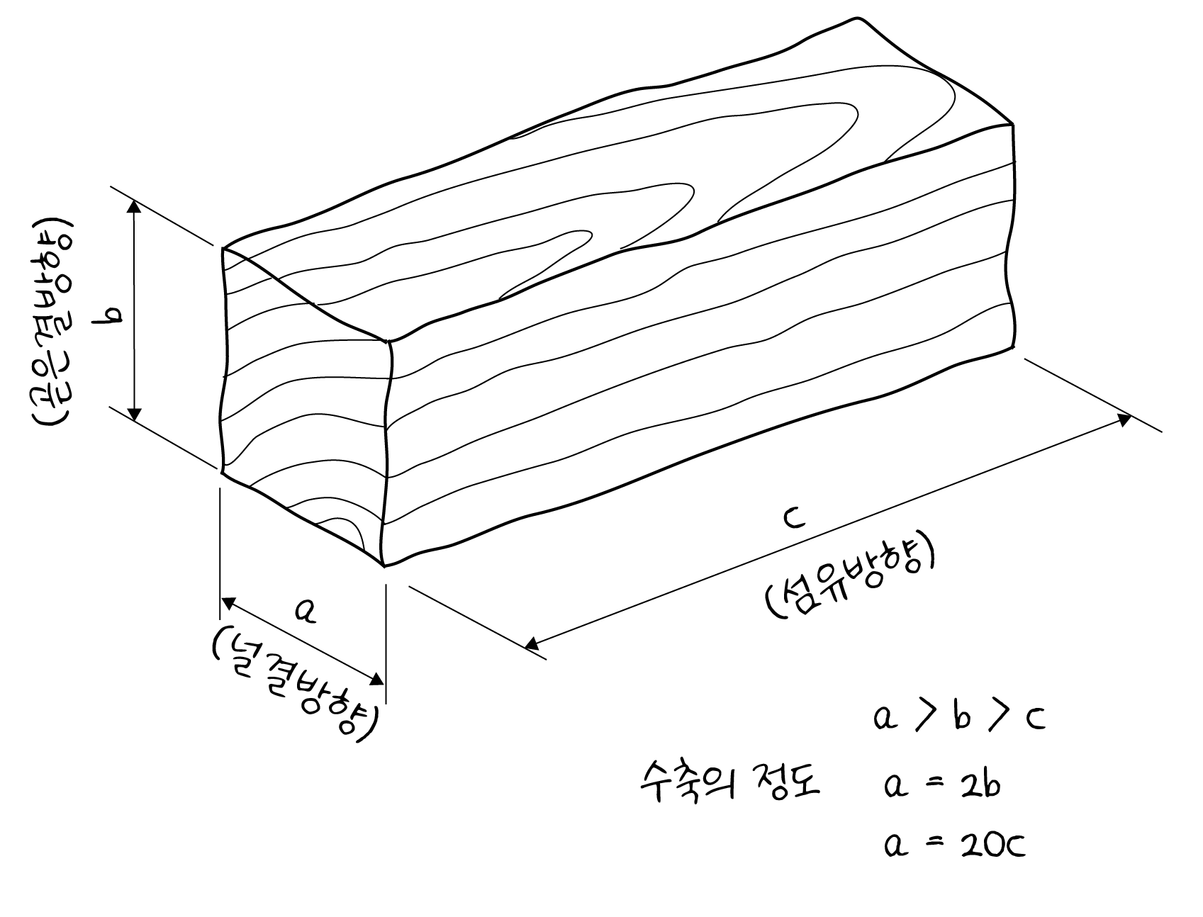 무늬결방향 : 곧은결방향: 섬유방향의 수축률비는 대략 20:10:1-0.5 정도가 됩니다. 그러니까 나이테 방향으로 가장 많이 줄어들고 그 다음이 나이테 직각방향, 그리고 나무가 자라는 섬유방향으로 가장 덜 줄어듭니다.