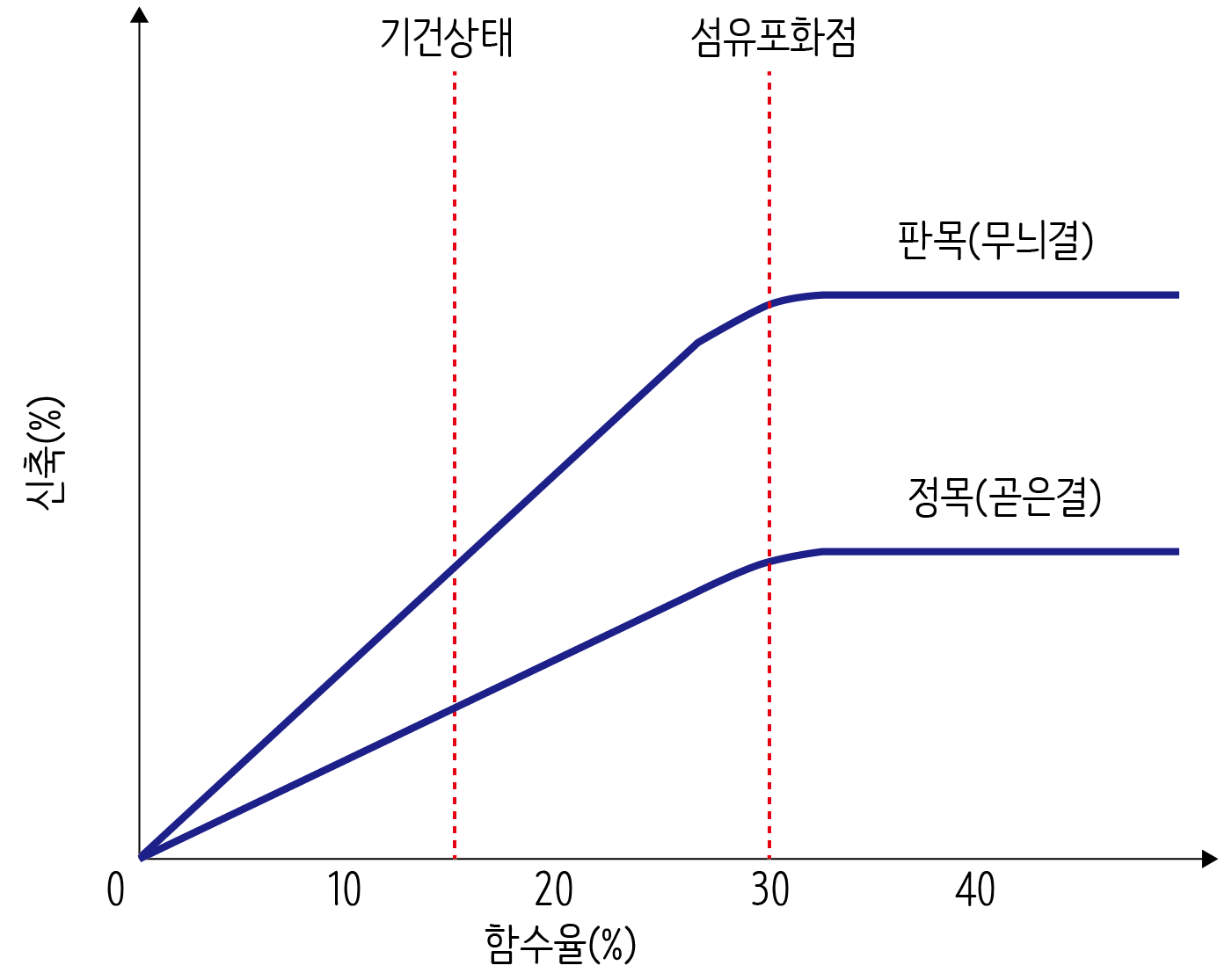 목재의 신축도 섬유포화점의 영향을 크게 받습니다. 생재 상태에서 섬유포화점까지는 수축되지 않지만 섬유포화점 아래로 내려가게 되면 목재는 점점 줄어들게 됩니다. 반대로 건조된 목재를 침수시키면 함수량이 점차 증가하면서 섬유포화점까지 팽창하게 되는데, 섬유포화점을 넘으면 체적이 변화하지 않습니다.