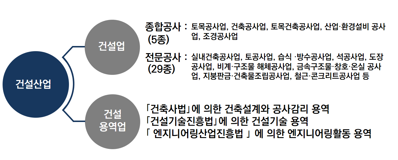 그러니까 건설산업은 크게 건설업과 건설용역업으로 분류되고, 세분화하면 다음과 같이 됩니다.