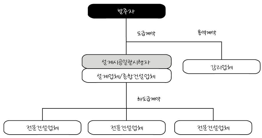 즉 우리나라에서는 “발주기관에서 제시한 기본계획(또는 기본설계) 및 지침에 따라 설계와 시공을 일괄하여 입찰하는 것” 을 의미하고 이것은 대안입찰도 동일합니다. 따라서 우리나라는 약간 좁은 의미로만 시행된다고 이해하면 될 것 같습니다. 한 개의 건설업체가 설계ᆞ시공을 모두 수행하건, 설계업체와 시공업체의 공동도급을 통하여 설계ᆞ시공을 모두 수행하건 설계ᆞ시공을 단일한 계약주체가 일괄하여 수행하는 공사를 의미합니다.