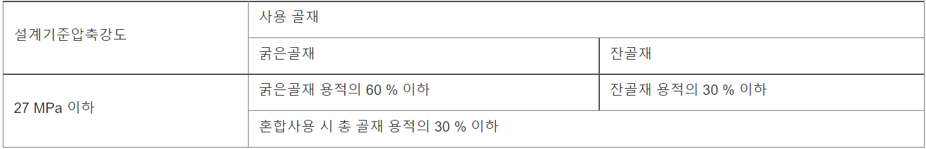 순환골재를 혼합사용하여 설계기준압축강도 27 MPa 이하의 콘크리트를 제조할 경우에 사용되는 순환골재의 최대 치환량은 총 골재 용적의 30 %로 한정하고 있습니다. 이때 순환굵은골재의 최대 치환량은 총 굵은 골재 용적의 60 %, 순환잔골재의 최대 치환량은 총 잔골재 용적의 30% 이하로 한정하고 있습니다.