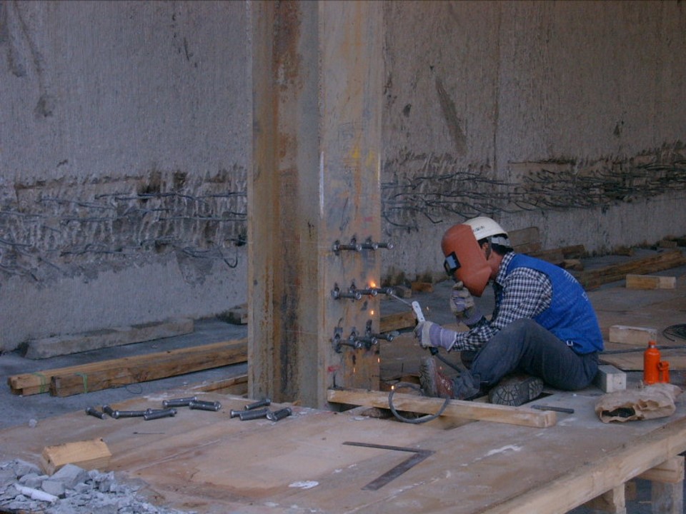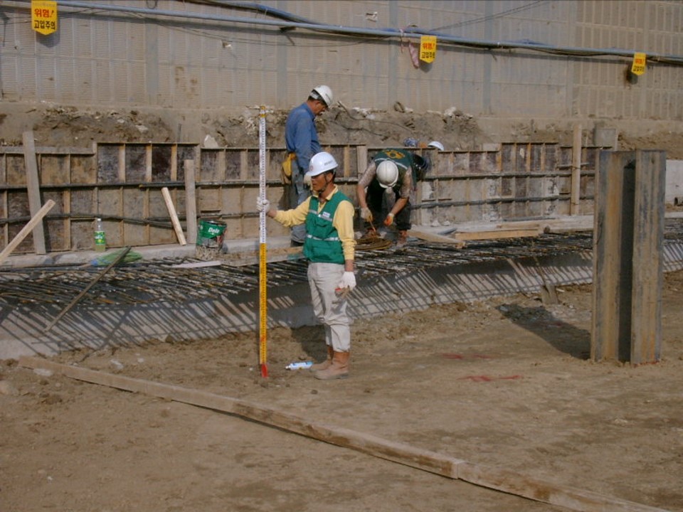 굴착이 완료된 후에는 강재 기둥을 설치하는데, 맨 아래 콘크리트 기초를 타설하는 부위에는 콘크리트와의 부착을 위해 스터드 볼트(Stud bolt)를 용접합니다. 아래 사진을 스터드 볼트를 검사하고 있는 상황입니다.