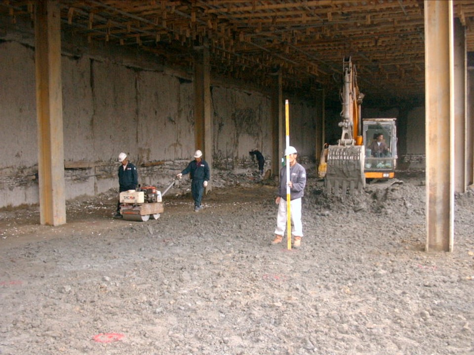 지하 기둥을 설치한 후에는 1층 슬래브를 시공합니다. 1층 슬래브를 시공하기 위해 바닥 레벨을 확인하고 있습니다.