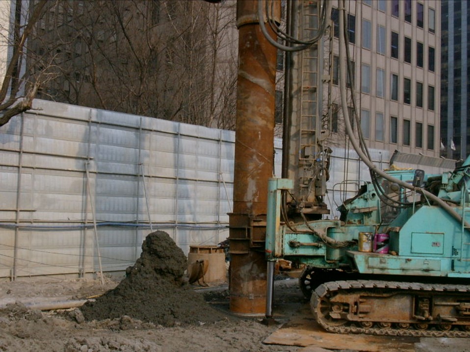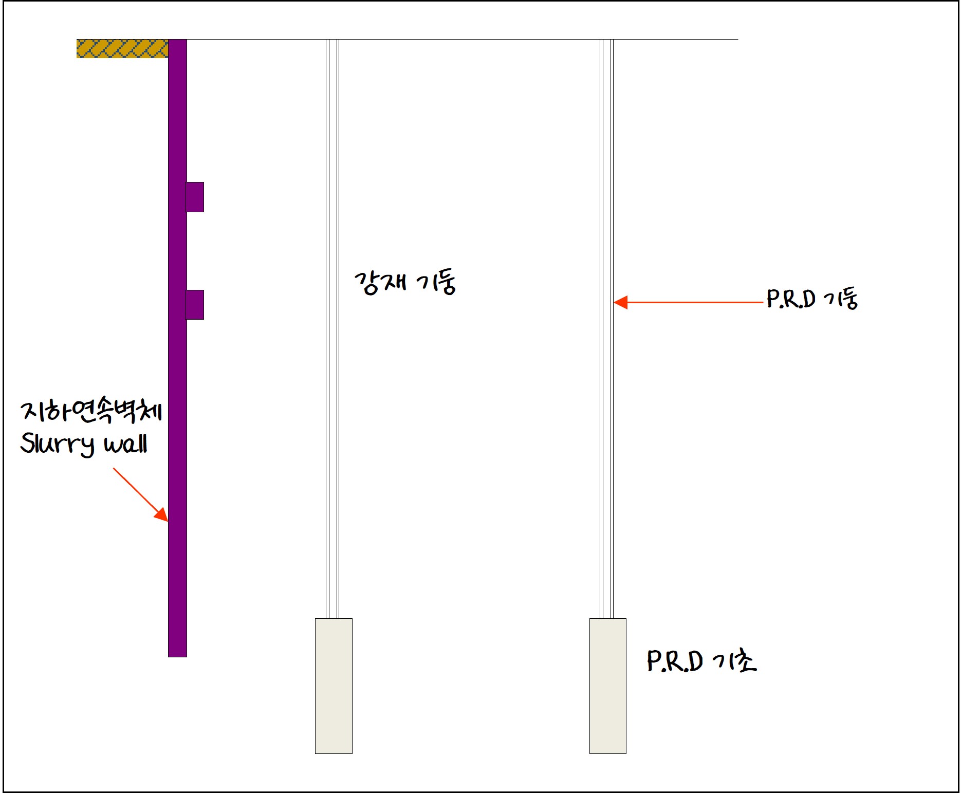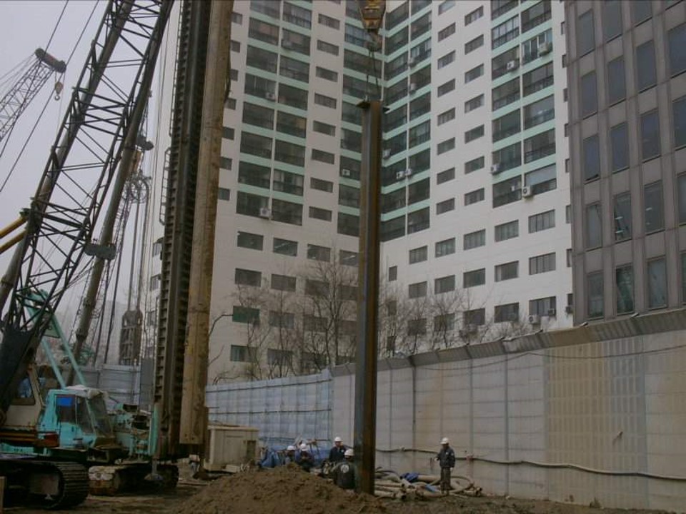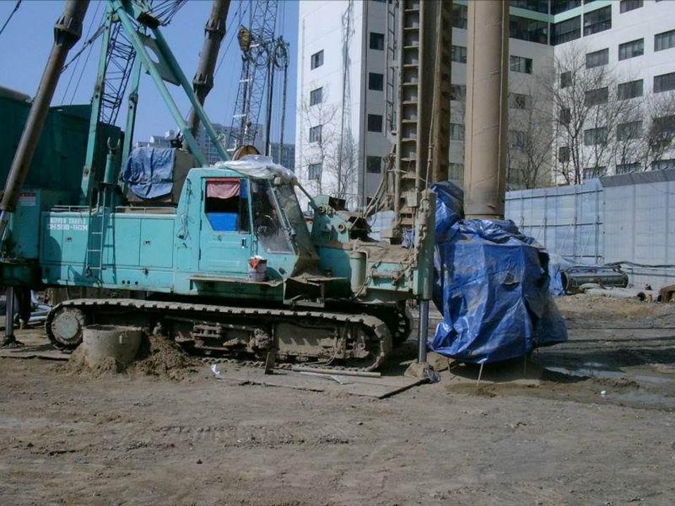 지하기둥을 먼저 시공하는 방법은 여러가지가 있는데, 여기서는 PRD( (Percusion Rotary Drill) 기둥을 시공하는 것을 살펴보겠습니다. PRD 기둥의 시공순서는 다음과 같습니다. 이 현장에서는 암반이 있어 기둥 하나를 굴착하는데 2.5일(2.5일/공) 정도의 공기가 걸렸습니다.