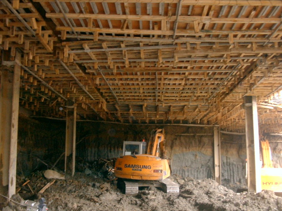 지하 1층 슬래브 콘크리트 시공이 끝나면 아래쪽으로 굴착해 갑니다. 이런 식으로 역타공법은 지상층에서 지하층으로 구조물을 만들어갑니다.