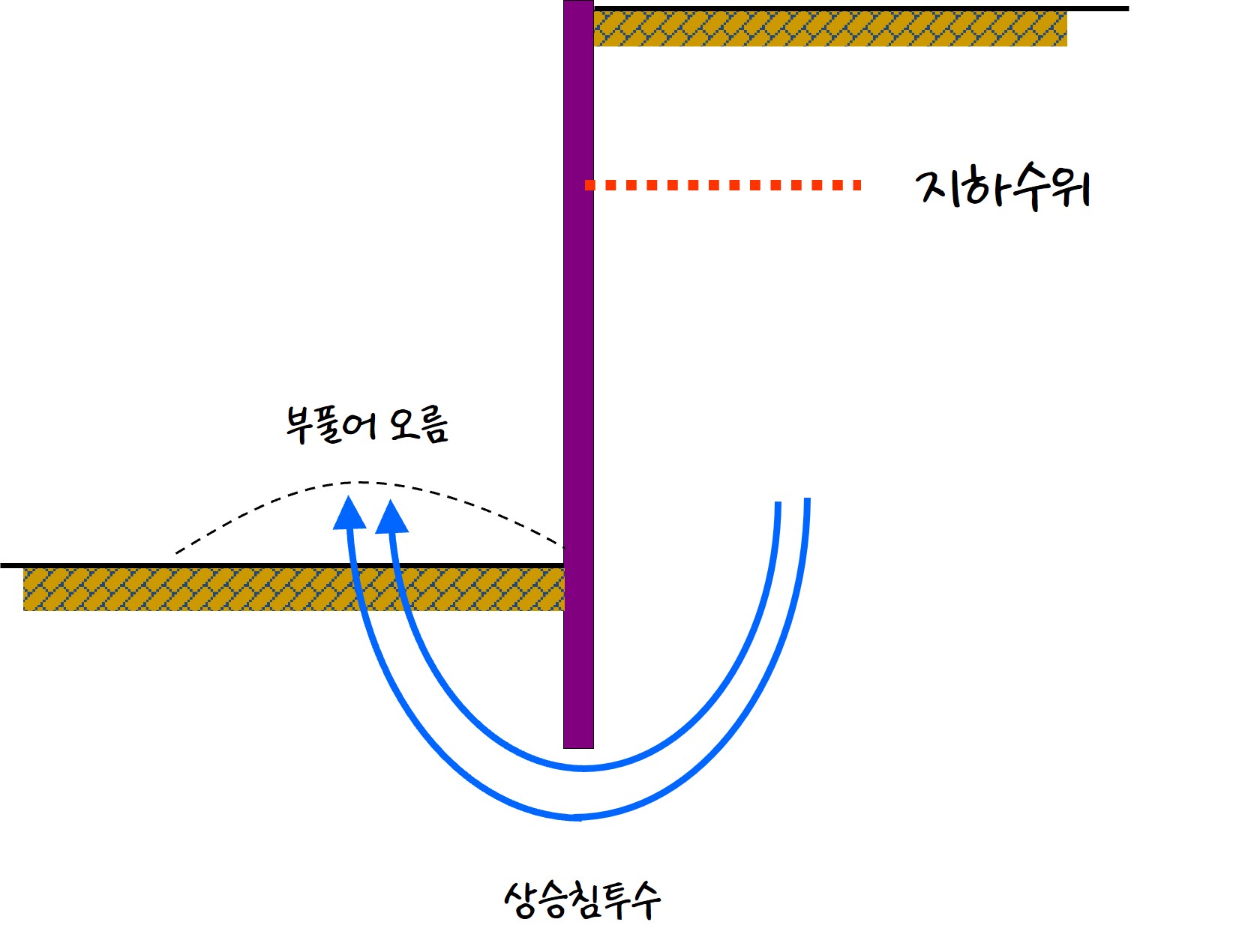 보일링은 지하수위가 높을 때 발생합니다. 지하수위가 높으면 흙막이 저면으로 물이 밀려들게 되는데 사질지반이면 토사와 함께 밀려드는 경우가 있습니다. 토사가 밀려들면 흙막이 바깥쪽 흙이 유실되면서 침하될 수도 있습니다.