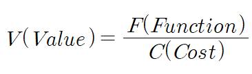 가치(Value)는 기능(Function)과 비용(Cost)의 균형으로 측정합니다. 가치지수(Value Index)를 구하기 위해서는 기능을 수치화할 필요가 있습니다. 기능을 수치화하기 위해서는 기능을 평가해서 상응하는 금액을 부여합니다.