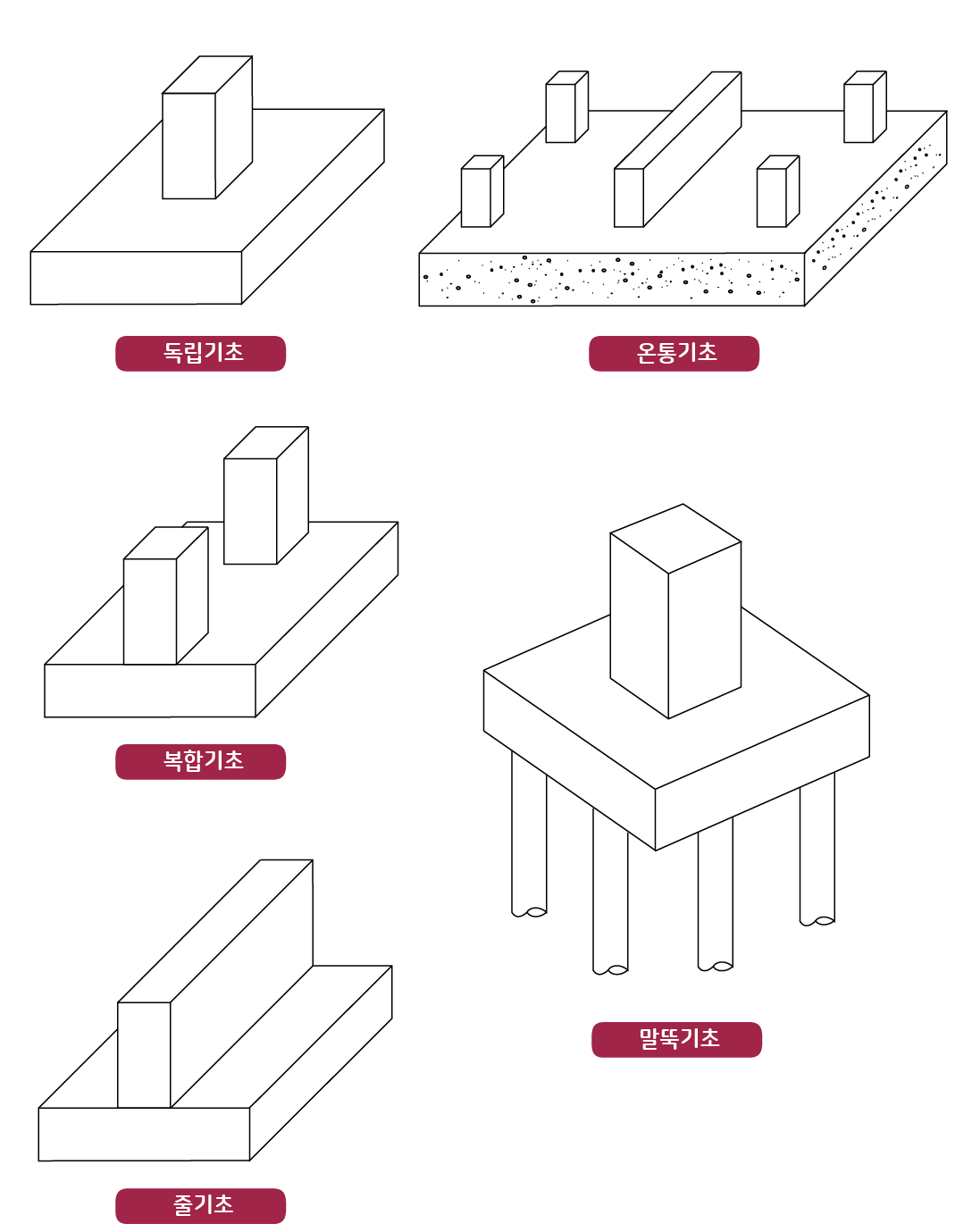 기초는 기초 위에서 하중을 실어 나르는 구조체의 형태(기둥, 벽 등) 와 지반의 특성에 따라 다양한 형태로 만들어집니다. 얕은기초(직접기초)를 모양에 따라 구분하면 독립기초, 줄기초, 온통기초(Mat foundation), 복합기초로 구분할 수 있습니다.
