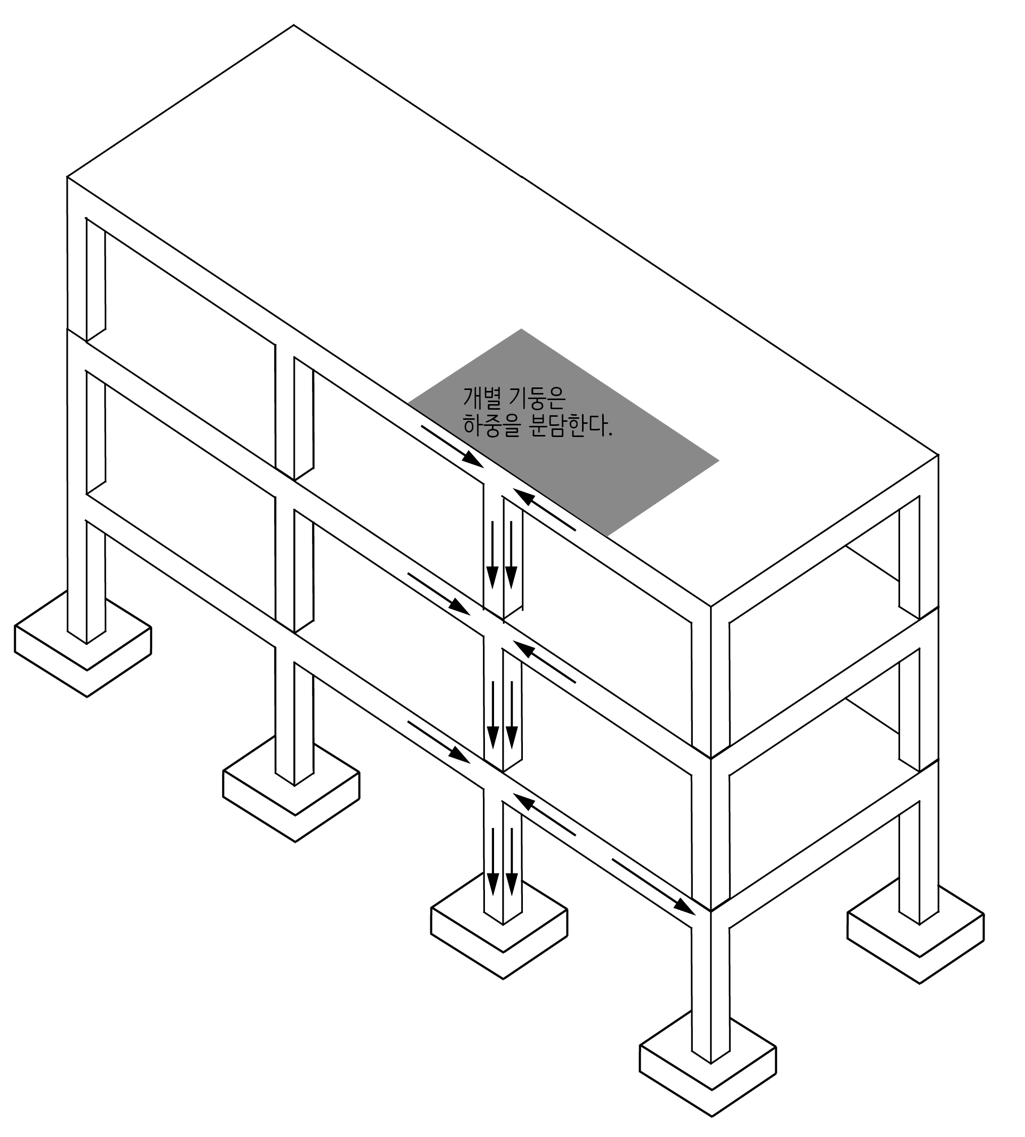 복합기초는 두 개 또는 그 이상의 기둥에서 전달되는 응력을 하나의 기초판 형태로 기초에 전달하는 방식입니다. 건물 외곽에 위치한 기둥을 지지하는 독립기초가 대지 경계선을 넘을 때 주로 사용합니다. 건물 외곽 쪽으로 기초가 확장되지 못하고 반대쪽으로 상대적으로 크게 확장되면서 내부 기초와 연결되는 형태입니다. 이런 방식으로 외곽 기둥과 내부 기둥의 하중을 모아 지반에 균일하게 전달합니다.