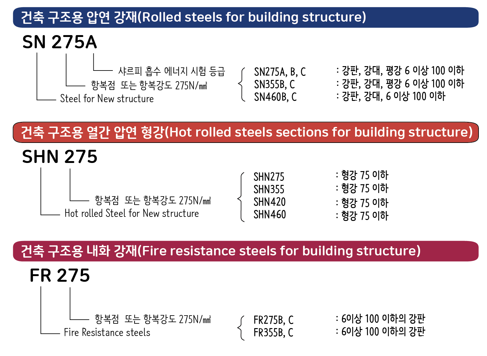 강재는 기호를 사용해서 제품의 규격을 표시하기 때문에 기호의 의미를 잘 기억해야 합니다. 맨 앞에 알파벳으로 강재의 종류를 표기하는데 그림을 보면 알파벳이 의미하는 것을 알 수 있습니다. 알파벳 다음에 붙이는 숫자는 항복점 강도를 의미한다. 예전에는 인장강도로 표시했지만 철근을 항복점으로 표시하기 때문에 철근의 표기 방법과 일치시키기 위해 항복점 강도로 표시하는 것로 KS를 바꾸었습니다. 용접 구조용 강재에서 항복점 강도 뒤에 붙이는 기호는 충격흡수에너지를 기준으로 강재의 품질을 나타낸 것인데 A에서 C로 갈수록 고품질 강재를 나타냅니다.