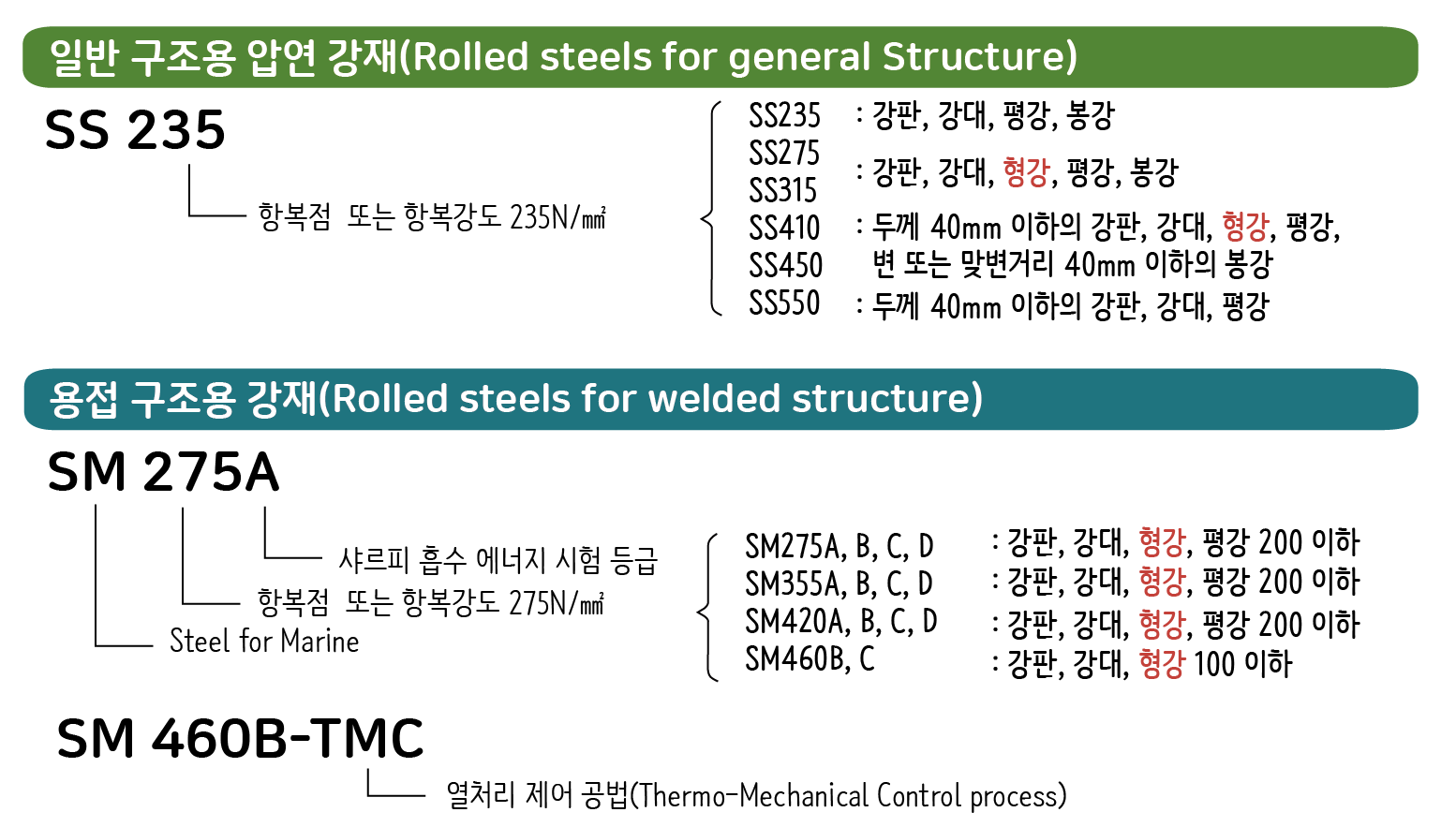 강재는 일반 구조용 강재와 용접 구조용 강재가 주로 사용되는데 이 외에도 내진 성능이나 내화 성능을 향상시킨 제품이 생산되면서 점점 고품질 강재의 사용 빈도가 높아지고 있습니다. 일반 구조용 강재는 용접을 하지 않는 부위에만 적용하는 것을 원칙으로 합니다. 용접 구조용은 용접을 하더라도 성능이 저하하지 않도록 처리한 강재로 용접으로 부재를 접합하는 부재 특히 선박용(Steel for Marine)으로 많이 사용되기 때문에 SM으로 표기합니다. 일반 구조용 강재는 SS400이 많이 쓰이고, 용접이 필요한 경우에는 SM400, SM490이 주로 쓰입니다.