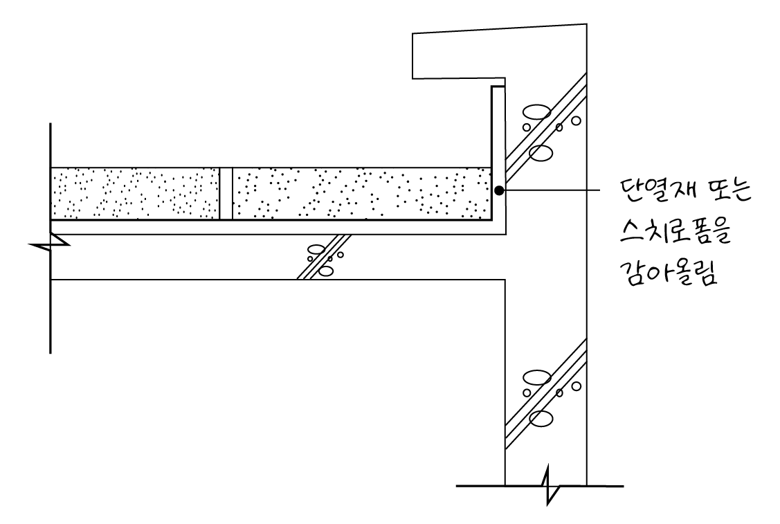 마직막으로 파라펫 등 치켜올림면이 있으면 평면부쪽으로 0.6m 내외로 줄눈을 작게 설치해야 합니다. 옥상방수는 파라펫 부위를 따라 방수층을 감아올려서 마무리하게 되는데, 보호 콘크리트의 팽창압력을 작게 만들기 위해서 부재를 작게 자르는 것입니다. 동일한 목적으로 벽면에 스치로폼 같은 완충재를 설치한다면 벽면의 방수층이 손상되는 것을 막을 수 있습니다.