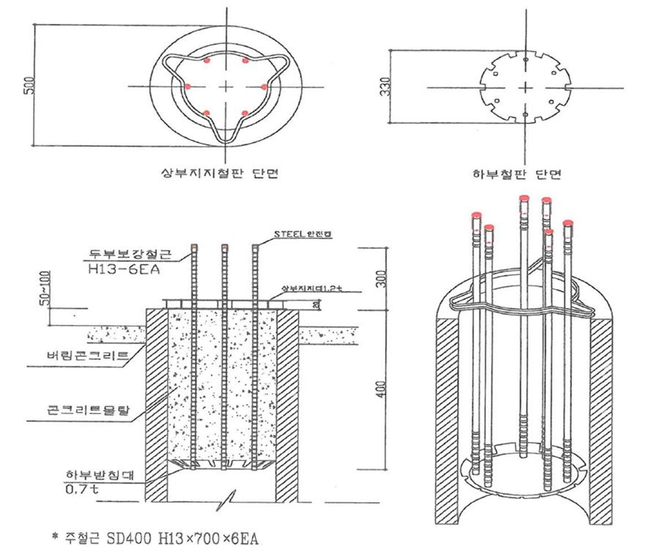 기초콘크리트 안으로도 지름의 40배만큼 정착이 되어야 하지만, 말뚝으로도 정착이 되어야 합니다. 그래서 보통 HD13 철근 6가닥을 사용하는데 중간부분에 말뚝머리에 걸리도록 상부지지대를 설치한 구조로 되어있습니다. 이것을 잘라낸 말뚝속에 넣어 설치하는데, 기초 콘크리트를 타설할 때 콘크리트가 말뚝 안으로 떨어지지 않도록 하부철판을 댄 구조로 되어 있습니다. 제조사에서 제공하는 도면은 다음과 같습니다.