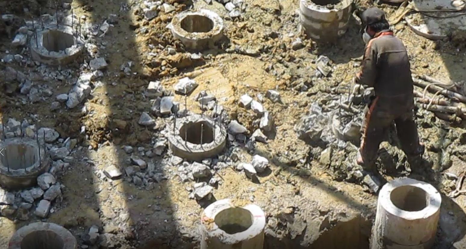 KCS 표준시방서에서는 말뚝머리를 정리할 때 말뚝본체를 손상하지 않아야 한다라고만 정하고 있습니다. 예전에는 아래 사진처럼 말뚝머리를 수작업으로 파쇄하기도 했지만 지금은 사람을 구하기도 힘들고 위험하기도 해서 더 수월한 방법을 사용합니다.