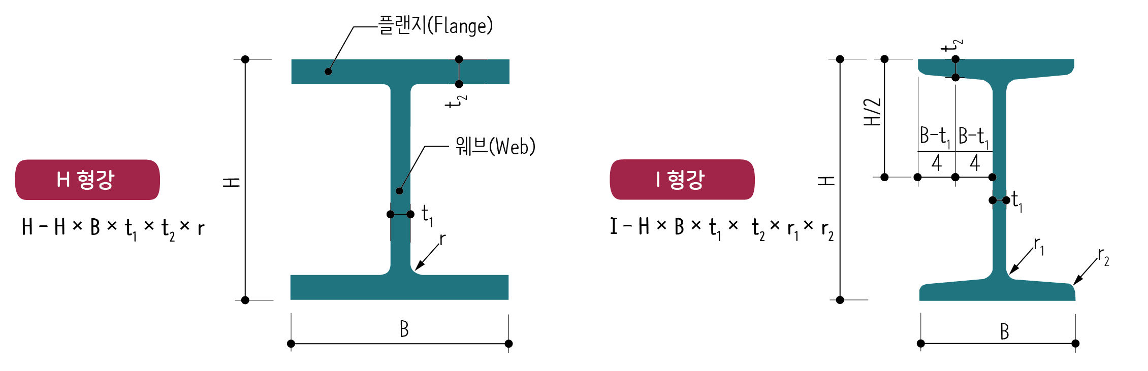 형강의 표기법도 기억해 둘 필요가 있습니다. 예를 들어 H형강은 웨브의 전체 높이, 플랜지의 폭, 웨브의 두께, 플랜지의 두께 순으로 표기합니다. 표기하는 순서를 약속해서 정해두면 숫자만 표기해도 형강의 모양을 전달할 수 있습니다.