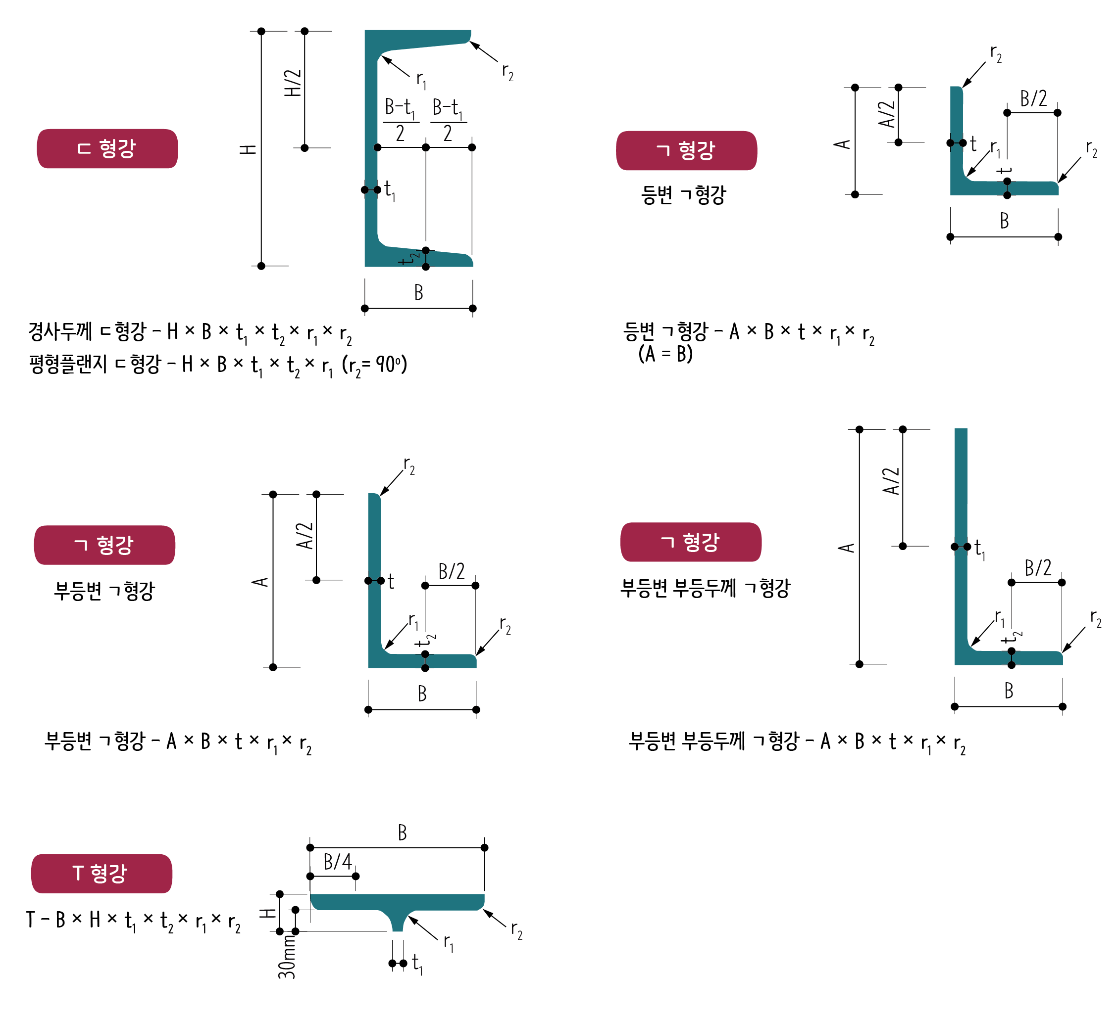 ㄷ, ㄱ, T형강은 일정한 축을 중심으로 대칭인 형상이며, 대부분 플랜지가 외부로 갈수록 줄어드는 형상으로 제조됩니다. 이 형강들은 휨모멘트가 생기면 비틀릴 우려가 있지만 접합하기가 쉬워 브레이스 같은 가새에 주로 사용됩니다. ㄱ형강은 보통 앵글이라고 불리는데, 두 변의 형상에 따라 등변 ㄱ형강, 부등변 ㄱ형강이 있습니다. T형강은 H형강의 웨브를 절단해서 주로 만들며 I형강을 절단하기도 한다.