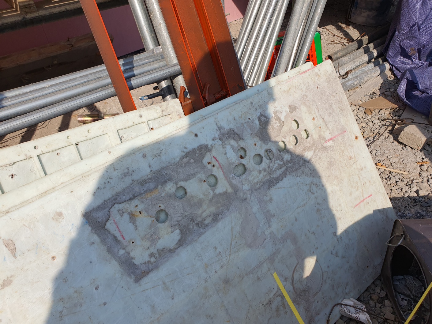 천장의 전기배선을 위해 어쩔 수 없이 거푸집널에 구멍을 뚫을 수 밖에 없기 때문에, 아래 사진처럼 파손이 될 수 밖에 없습니다. 따라서 이렇게 파손된 것들을 제외하면 표면이 거칠어졌을 때 다시 갈아내면서 재사용할 수 있기 때문에 전용횟수가 꽤 높다고 할 수 있습니다.
