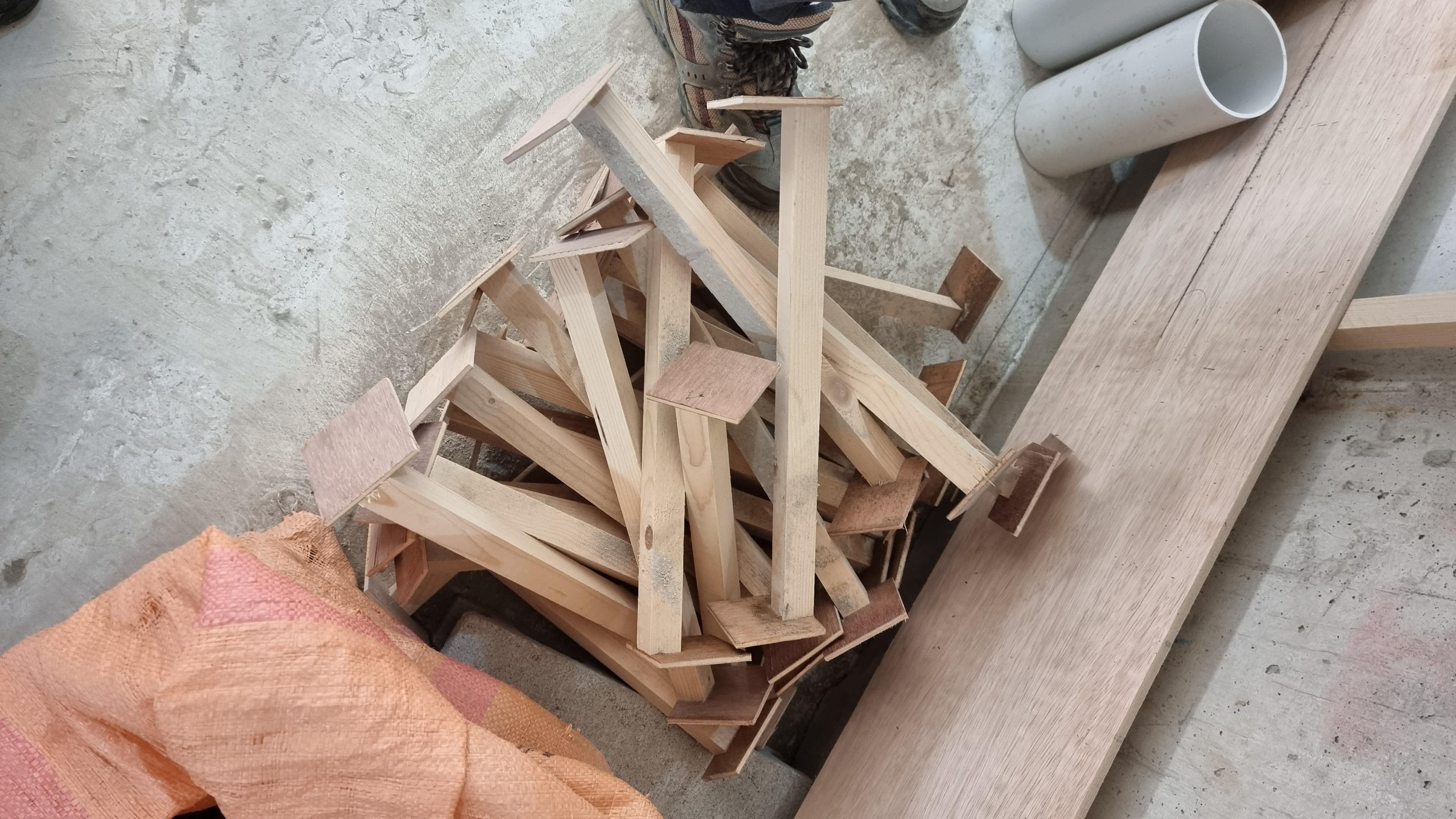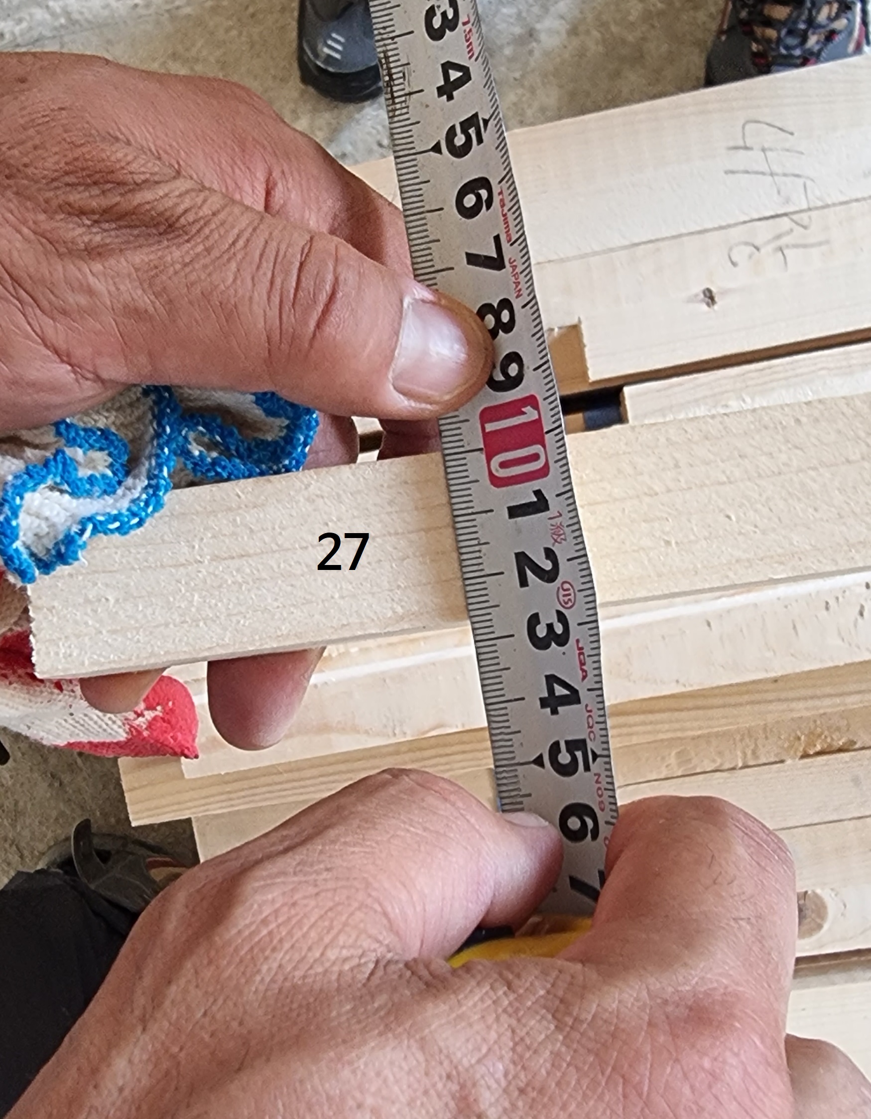 수평 다루끼는 아래 사진처럼 일정한 치수로 미리 만들어 둡니다. 위 사진처럼 평평한 틀을 만든 다음에는 석고보드나 합판을 붙이게 되는데, 석고보드의 폭이 900mm이기 때문에 900의 절반인 450 간격으로 수직방향의 다루끼를 설치해야만 합니다. 따라서 450에 다루끼의 폭인 30(27)을 빼면 대략 420의 폭으로 만들면 됩니다.