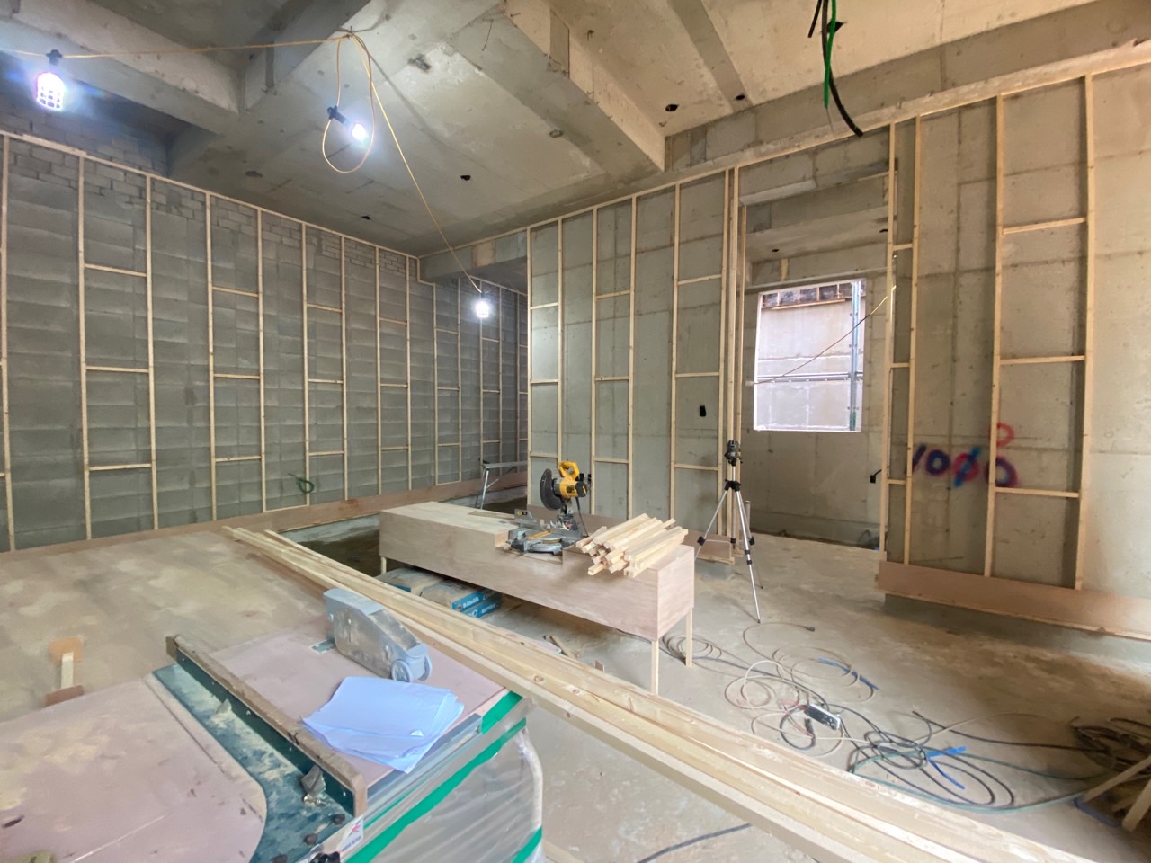 그래서 수평, 수직이 딱 맞는 평평한 벽면을 만들기 위한 바탕으로 다루끼를 붙이는 것입니다. 물론 내단열이라고 하면 다루끼 사이에 단열재를 붙이기도 하지만, 이 현장은 외단열이라 외벽 바깥쪽에 단열재를 붙였기 때문에 내부에 단열재를 붙이지 않았습니다.