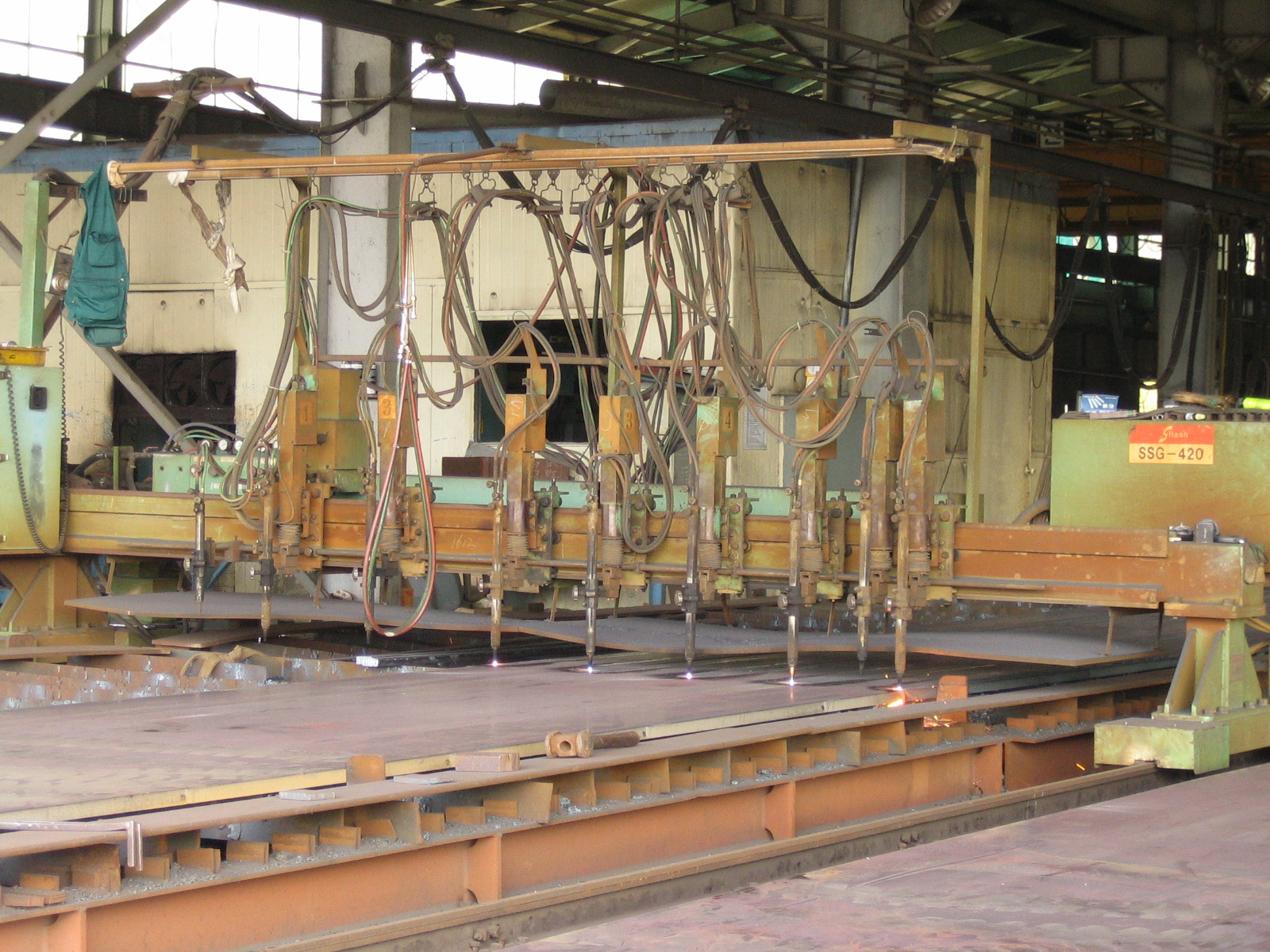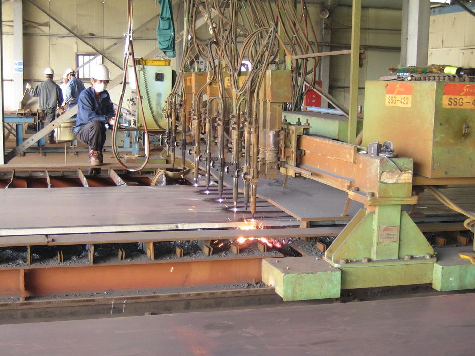 아래 사진은 조립부재(Built-up) 부재를 제작하기 위하여 강판을 절단하는 과정을 보여줍니다.