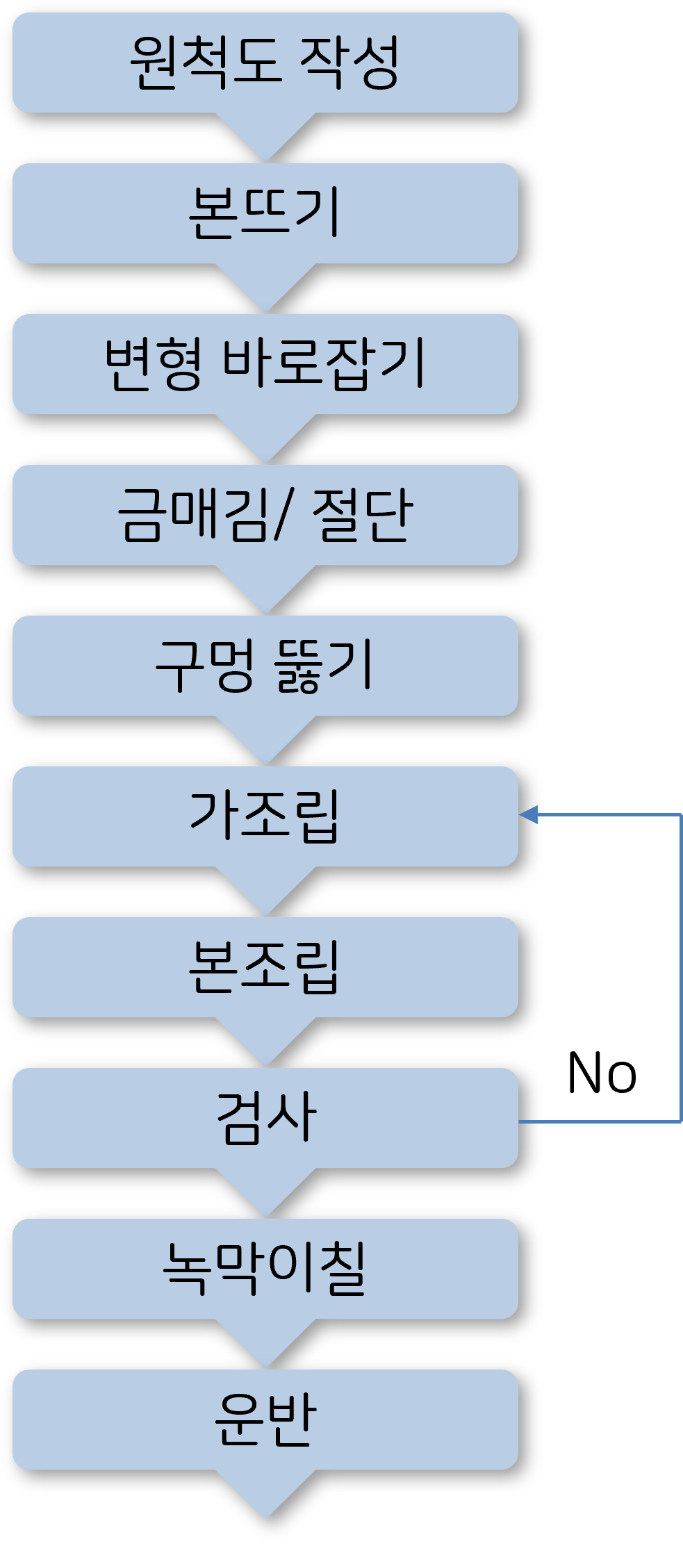 보통 강구조 가공공장의 진행프로세스를 다음과 같이 진행되어 왔습니다. 그런데 지금은 많은 부분이 자동화되어 원척도 작성이나 본뜨기 같은 과정은 하지 않아도 됩니다.