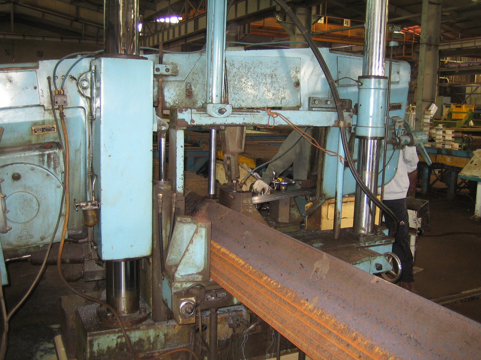 아래 사진은 공장에 반입되 부재를 필요한 길이에 맞추어 절단하는 과정을 보여주고 있습니다.