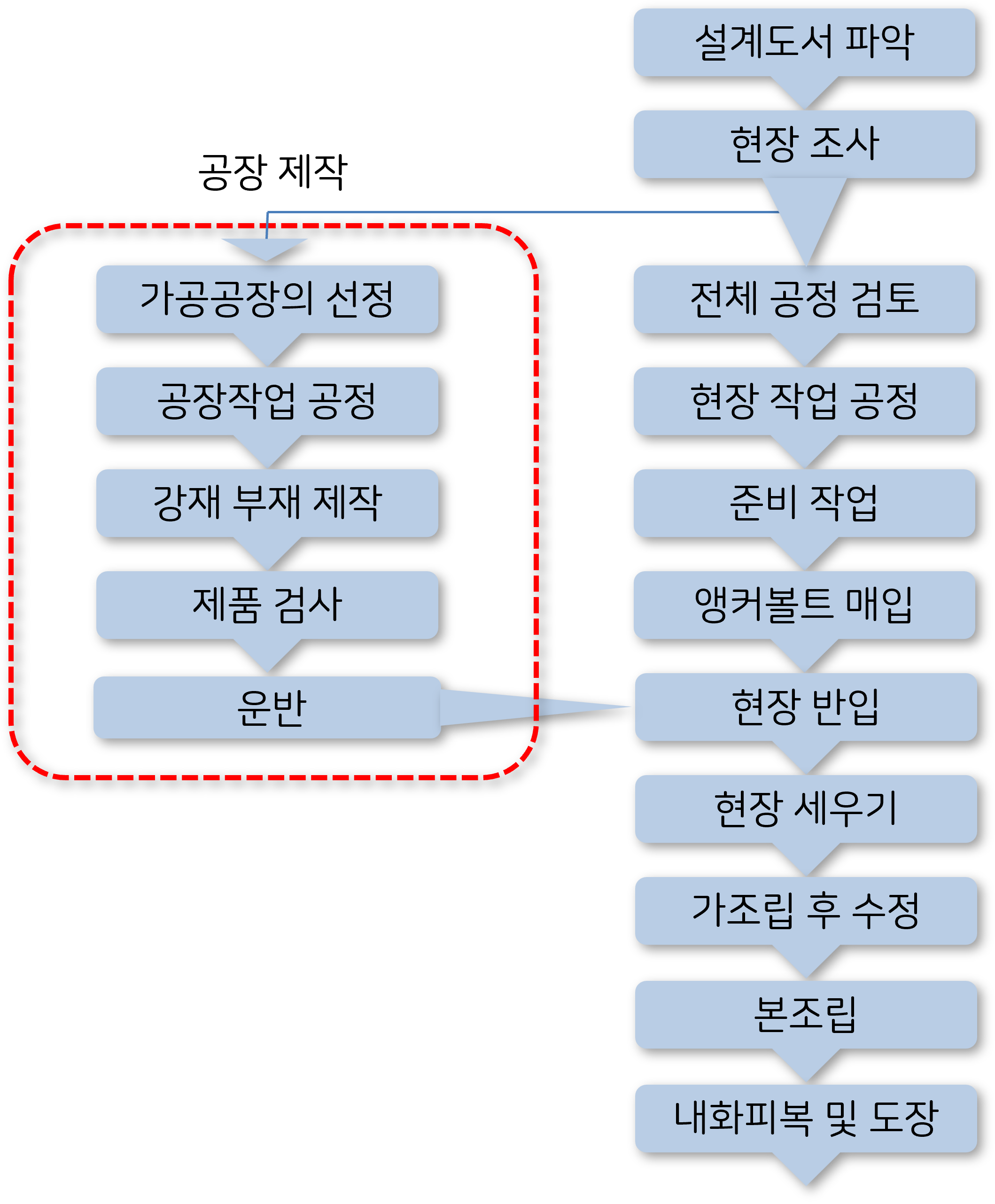 위 그림에서 보시는 것처럼 현장에서 조립하기 전까지 완성된 형태로 부재를 반입해야 하기 때문에 공장에서의 작업이 많은 비중을 차지합니다. 현장에서의 조립 일정에 맞출 수 있도록 조기에 가공공장을 선정하고 공장 제작과정을 진행해야 합니다.