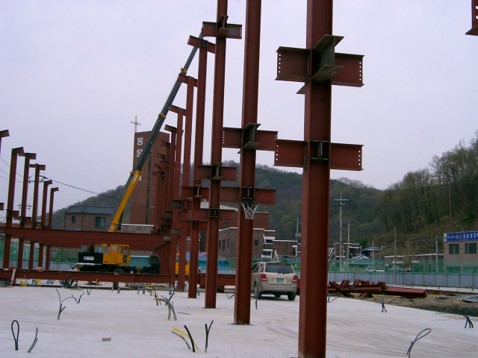 철근콘크리트공사는 현장에서 거푸집, 철근, 콘크리트 타설까지 많은 작업을 해야 합니다. 그러나 강구조공사는 철근콘크리트와는 달리 공장에서 부재를 가공한 후 현장에서는 조립만 하는 과정으로 진행됩니다.