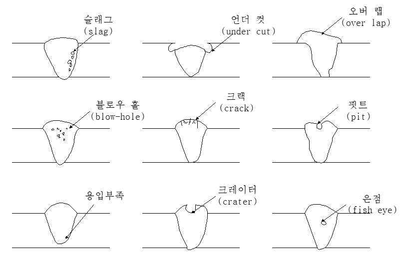 | 피시아이(Fish eye) | - 용착금속 단면에 생기는 지름 2∼3㎜ 정도의 은색 원점 - 수소의 영향으로 생긴 것으로 100℃로 가열하여 24시간 방치하면 수소가 방출되어 회복됨 |