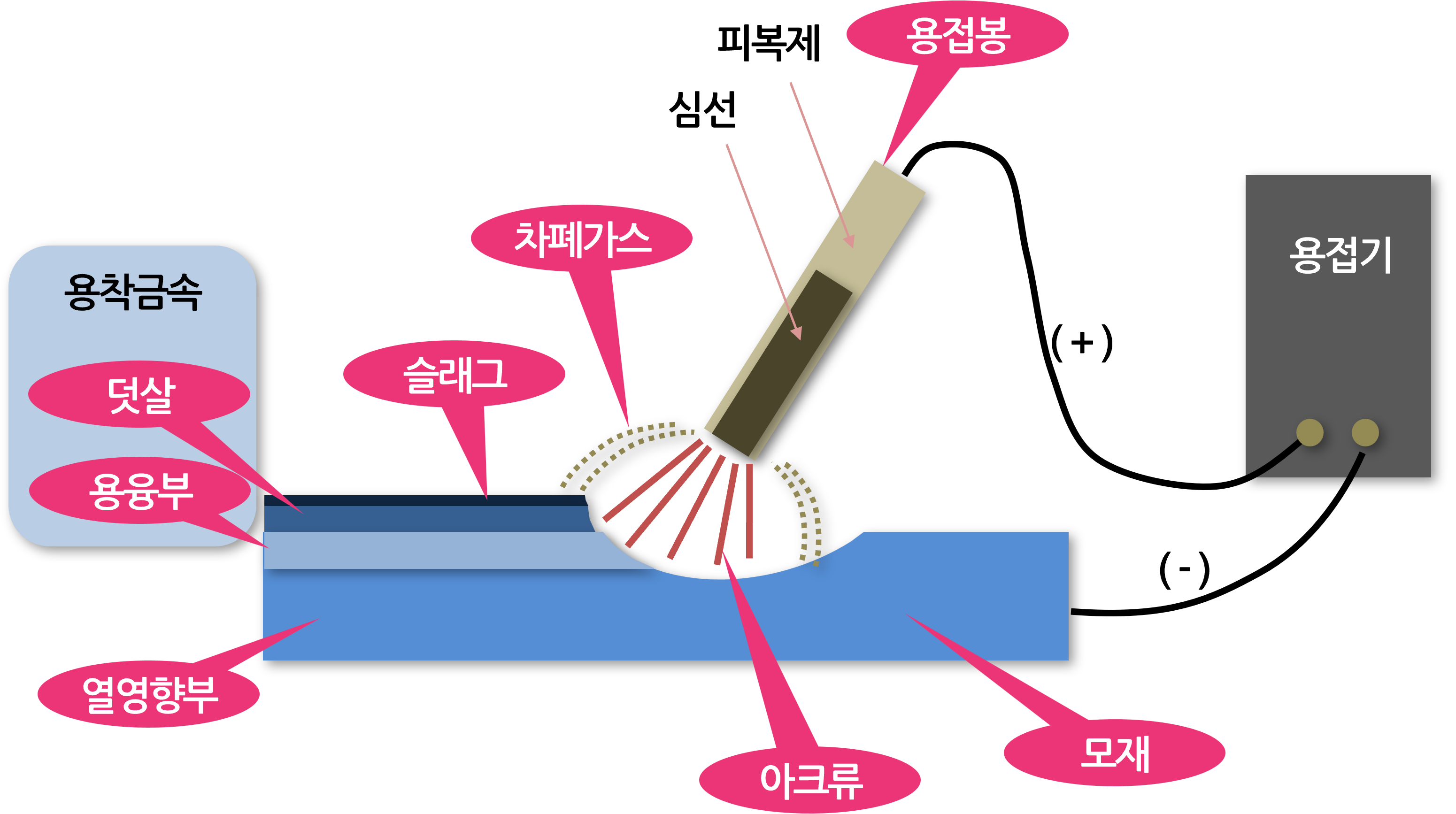 위 그림에서 보면 용접봉과 모재 사이에 전압을 걸면 용접봉과 모재 사이에 이온이 흘러 아크열을 발생하고, 이 아크열(600℃)로 인해 모재와 용접봉이 녹아 용착금속이 새로 생성된 것을 볼 수 있습니다. 접합부에는 모재와 용가재가 혼합된 새로운 강(용접금속)이 생성되는 식입니다.