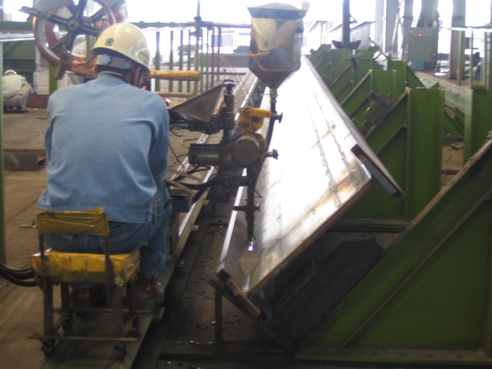 자동용접에서는 용접 부위에 분말 모양의 플럭스를 북돋아 심선을 그 속에 가라앉혀 보호하는 서브머지드(Submerged) 아크 자동용접을 사용합니다.