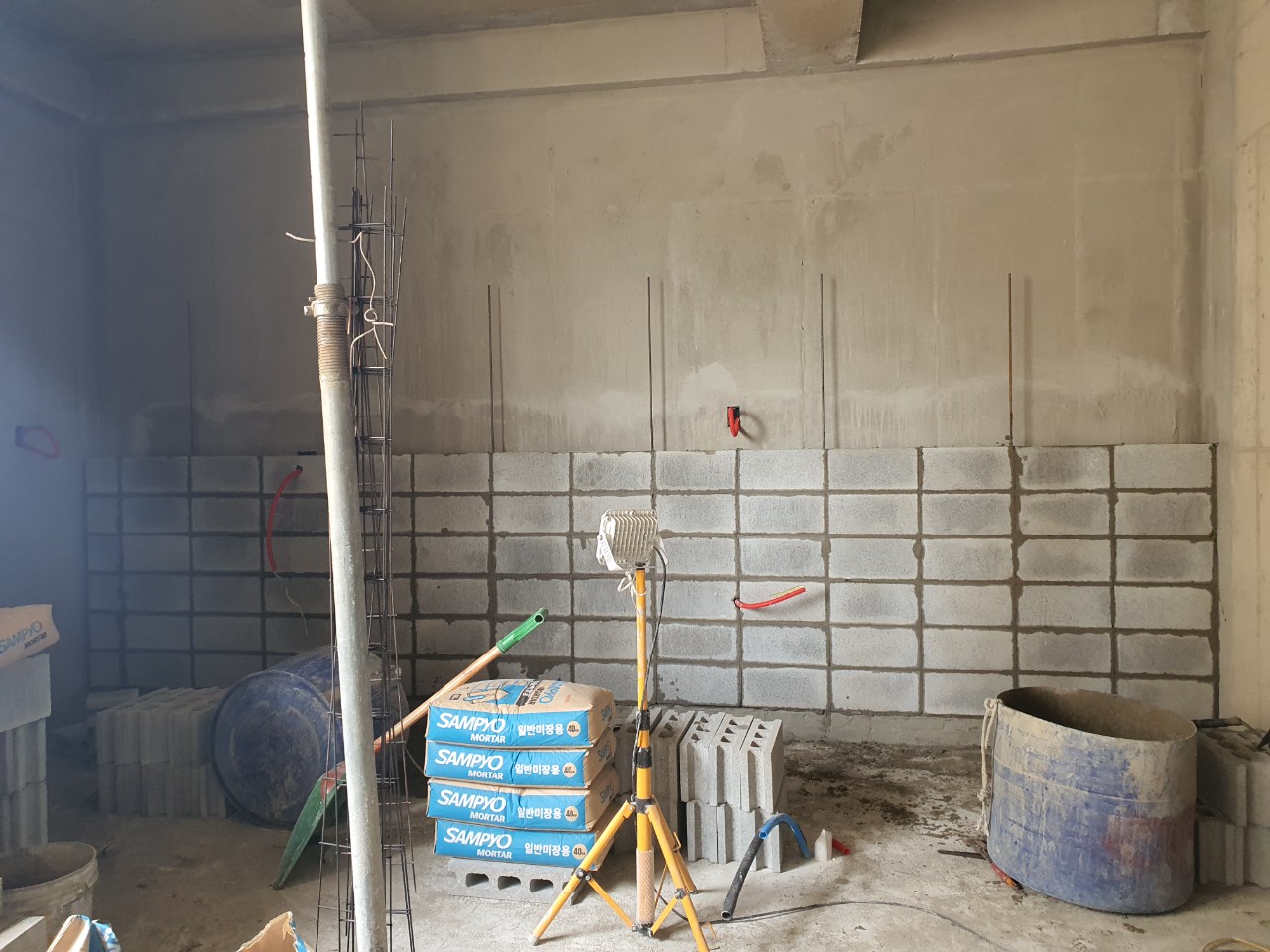 보강 블록은 아래 사진처럼 철근과 콘크리트로 보강하는 방식입니다.