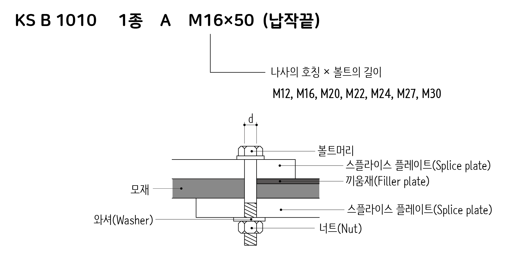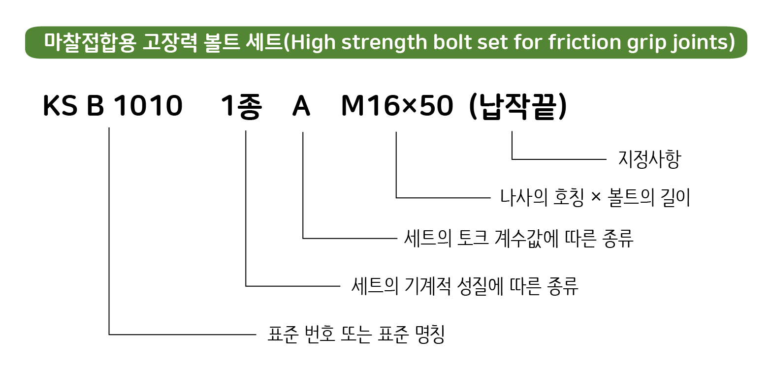 고장력 볼트 접합으로 2종이 가장 많이 쓰이는데, 2종인 F10T는 인장강도가 1,000N/mm² 이상인 제품입니다. F는 마찰력(Friction)을 의미합니다.