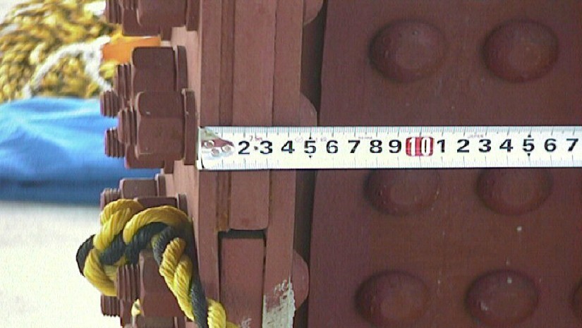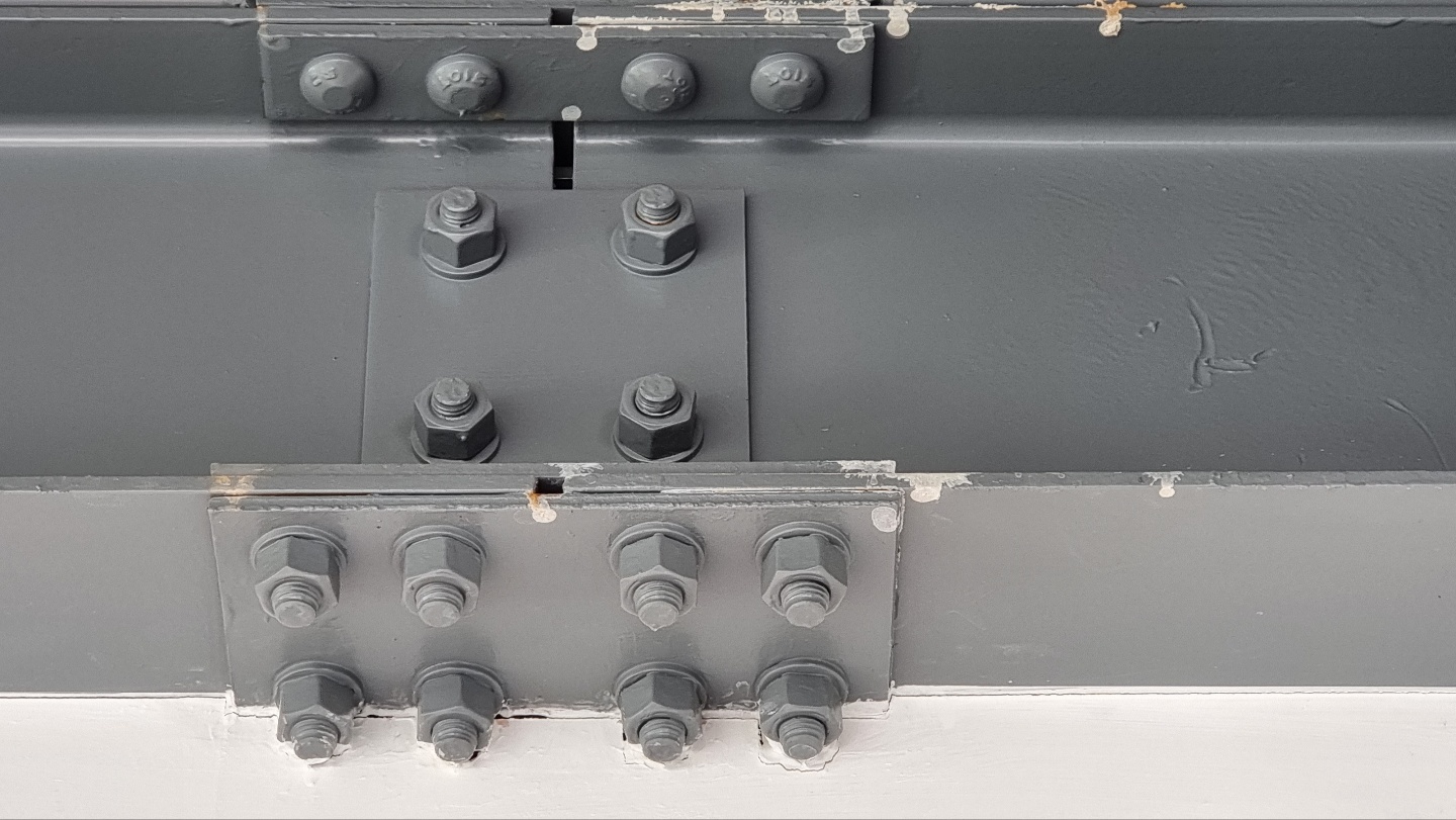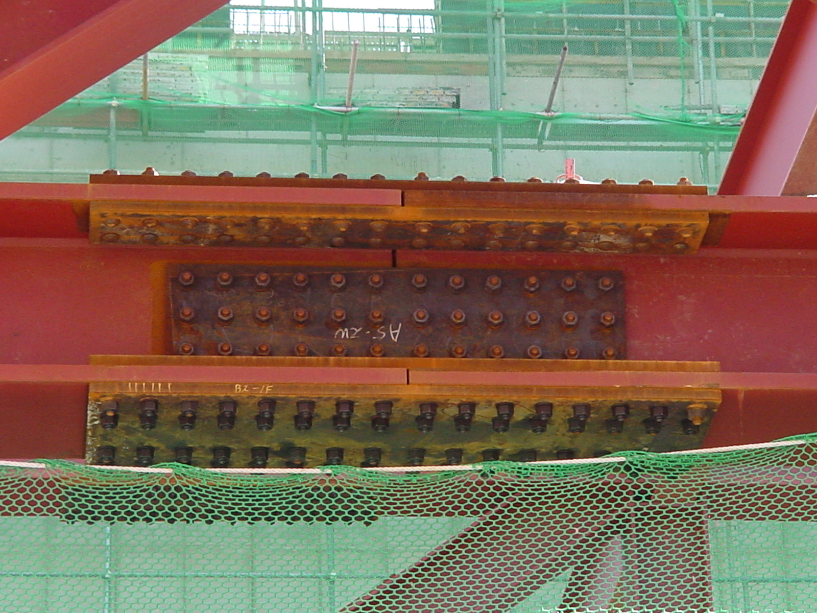 고장력 볼트로 마찰접합을 할 경우 맞닿는 부재면이 충분히 밀착되어야 합니다. 만일 모재 두께가 달라서 1mm 이상 차이 나게 되면 두께 차이만큼 끼움재(Filler plate)를 덧대서 모재가 충분히 밀착되도록 해야 합니다. 아래 사진을 보면 위쪽 부재의 두께가 얇아 끼움재를 덧댔는데 너무 두꺼운 것을 끼우는 바람에 안 끼우는 것만 못하게 되어버렸습니다.