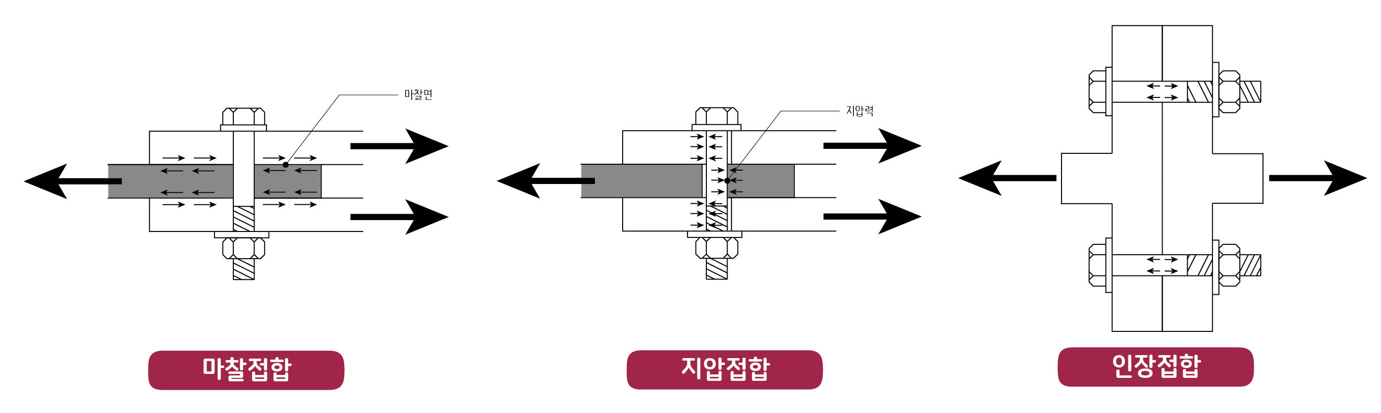 볼트접합은 볼트에 발생하는 응력에 따라 마찰접합, 지압접합, 인장접합으로 구분할 수 있습니다.