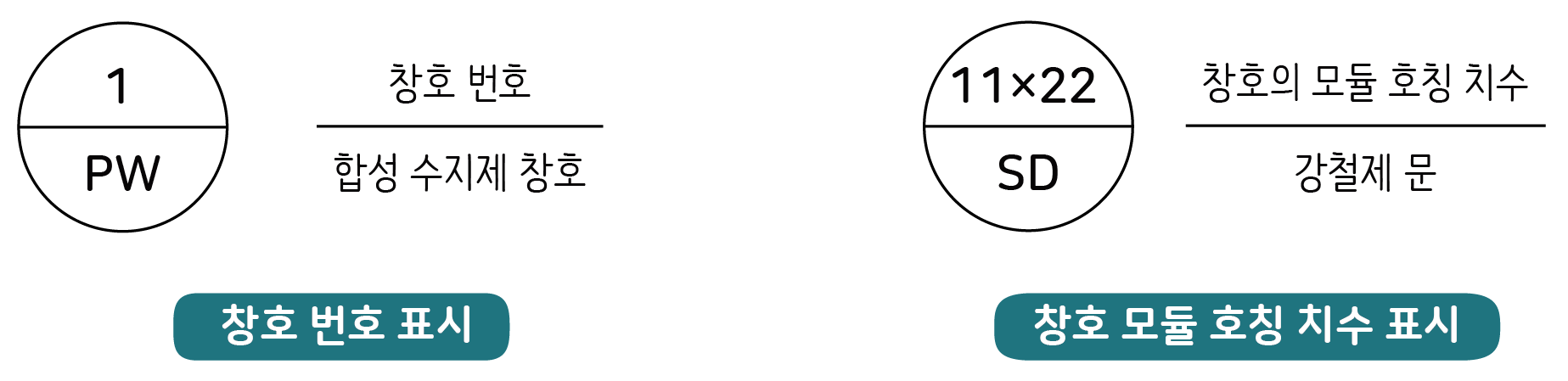 도면에 창호를 표기할 때는 창호의 종류와 번호를 기입해서 구별한다. 창호의 모듈 호칭 치수는 ‘나비 × 높이’로 기입하며, 치수의 단위는 1M(=100mm)으로 한다.
