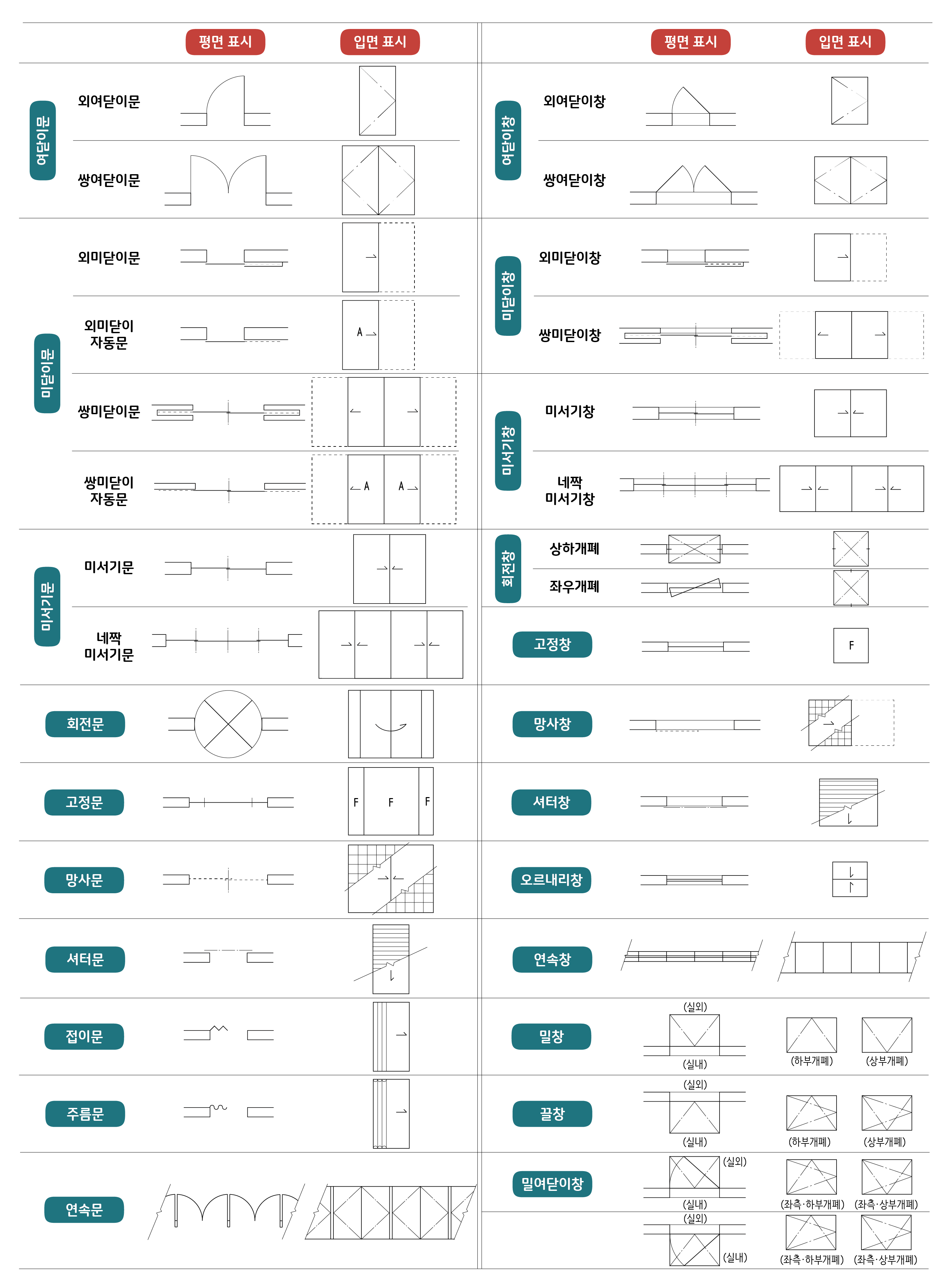 창호 유형별 기호는 창호 재질과 용도를 나타내는 알파벳 대문자를 조합해서 사용합니다. 예를 들어 재질이 알루미늄 합금이라면 A(Aluminum)로 쓰고, 창으로 쓰였다면 W(Window)를 써서 AW로 나타냅니다. 재질을 먼저 쓰고 용도를 나중에 써서 유형별 기호를 조합합니다.
