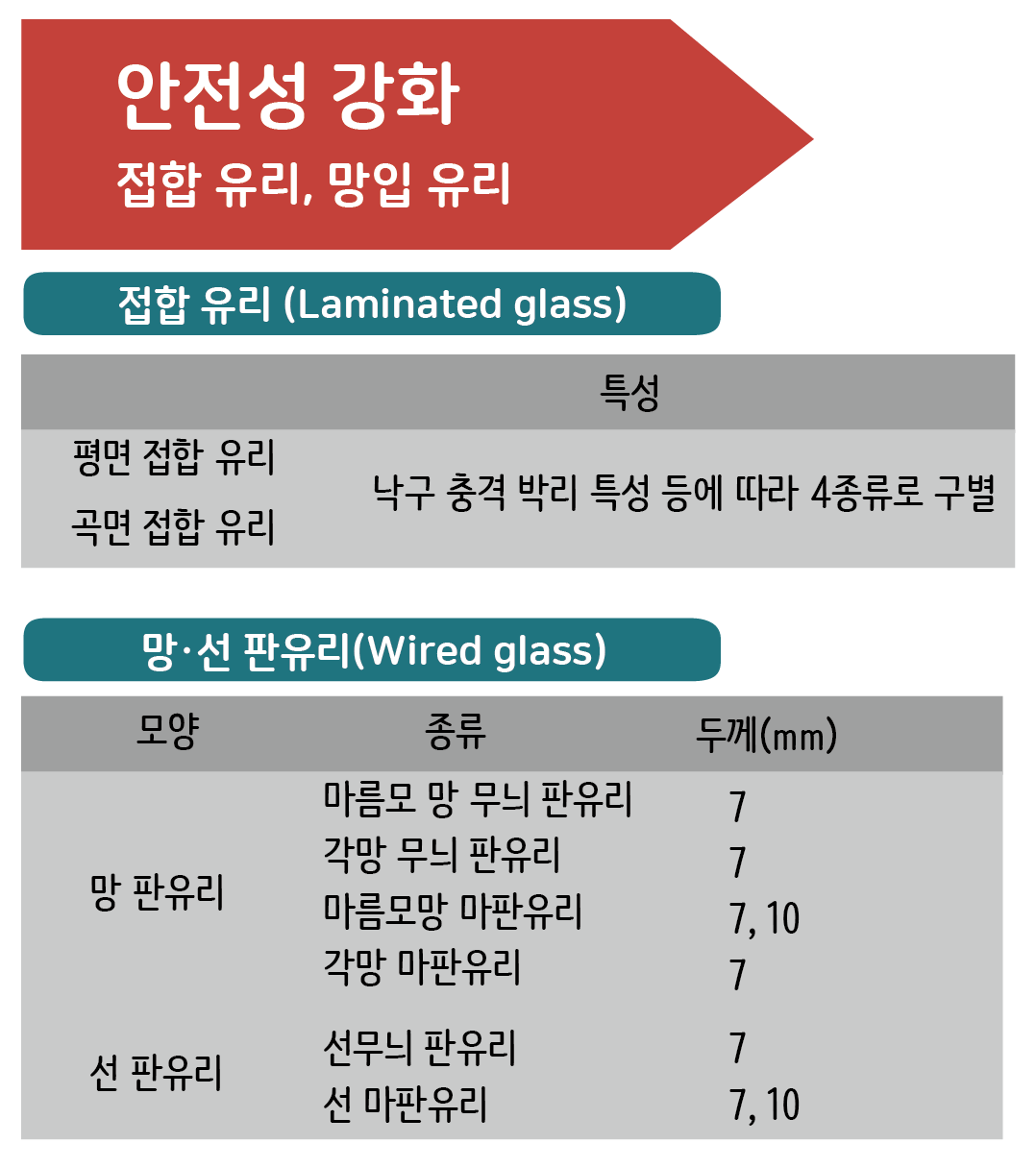 유리의 안전성을 높인 제품으로는 접합 유리(Laminated glass)와 망·선 판유리(Wire glass)가 있습니다.