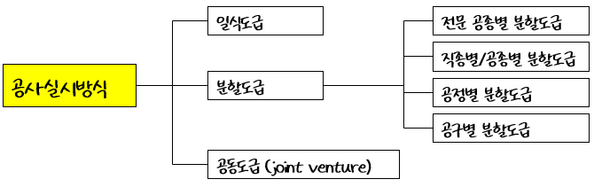 지금은 대부분 도급방식으로 공사를 수행하는데 한 공사 전부 또는 일부를 수급자에게 맡기는 방식입니다. 일식도급, 분할도급으로 구분할 수 있습니다. 분할하는 방식에 대해서는 다시 살펴보겠습니다.