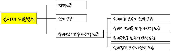 공사비 지불 방식에 따라 구분하면 정액도급, 단가도급, 실비정산 보수가산식 도급이 있습니다. 정액(혹은 총액) 도급이 가장 일반적이지만 나머지 제도의 특징도 기억해 두시기 바랍니다.