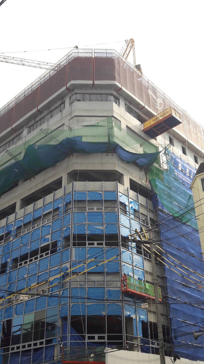 비젼은 커튼월 중에서 유리를 끼워 채광과 조망이 가능한 부분을 말합니다. 아래 사진을 보면 유리 색상을 선택하기 위해 유리 견본이 설치되어 있습니다.