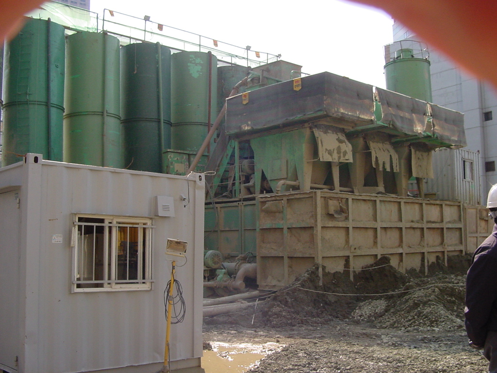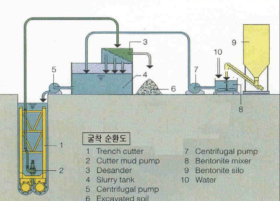 안정액을 채운 상태를 굴착을 하다보면 굴착부분에서 떨어져 나온 흙입자들이 계속 섞일 수 있기 때문에 굴착부분의 흙입자들을 계속 배출해 주어야 합니다. 그리고 안정액의 밀도를 일정하게 유지하기 위해 계속해서 순수한 안정액을 계속 공급해 주어야 합니다. 그래서 이런 설비를 현장에 갖추려면 현장에 충분한 공간이 있어야 합니다.