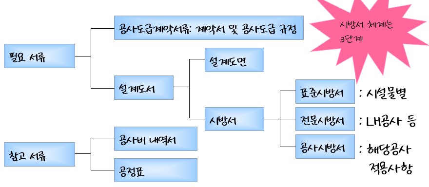 위 정의만으로는 이해하기 어려울 수 있는데요, 가장 상위에 있는 것이 표준시방서이고, 표준시방서를 근거로 전문시방서를 만들고, 표준시방서와 전문시방서를 기준으로 공사시방서를 만드는 체계로 되어 있습니다. 공사시방서만 계약도서에 포함됩니다.