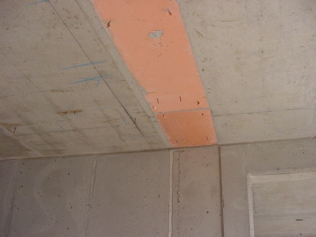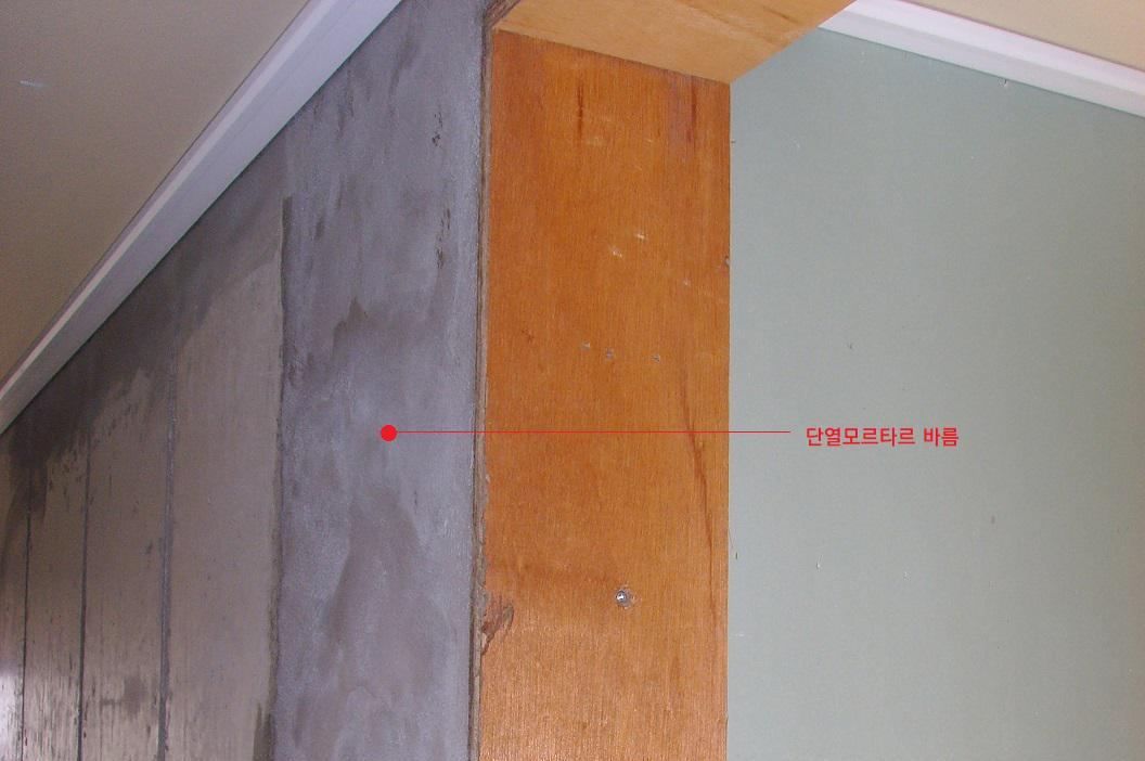 벽체는 슬래브에 부착한 단열재 폭만큼 홈을 만들어둔 후 나중에 단열 모르타르를 발라 단열 처리를 합니다. 다음 사진은 벽체의 홈 부분에 단열모르타르를 발라 처리한 사진입니다.