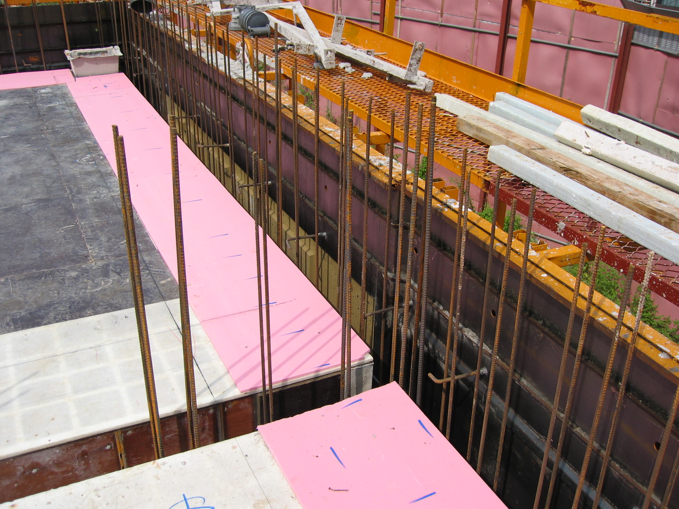 슬래브 거푸집에단열재를 미리 부착한 뒤 콘크리트를 타설하면 열이 전달되는 경로를 길게 만들어 열교현상을 줄일 수 있습니다.