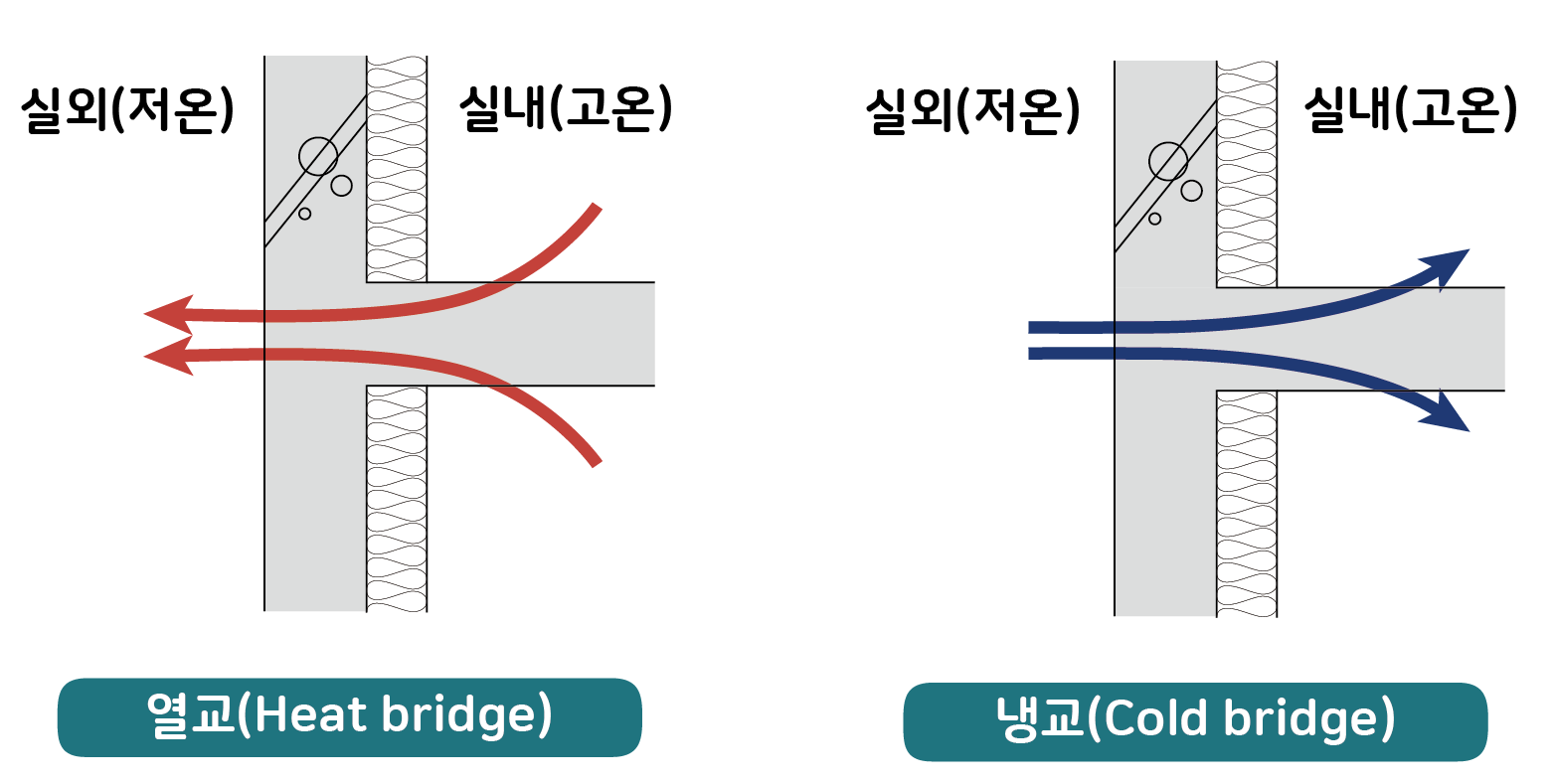 이처럼 단열재를 설치하지 않아 열저항이 낮아진 부위로 많은 열이 나가거나 들어오는 경로를 열교 또는 냉교라고 합니다. 겨울철이 되면 이 부위의 표면 온도가 노점 온도(공기가 포화되어 수증기가 응결할 때의 온도) 이하로 내려가서 결로가발생하게 됩니다. 결로는 곰팡이의 원인이 되기 때문에 열교가 생기지 않도록 단열 처리를 꼼꼼히 해야 합니다.