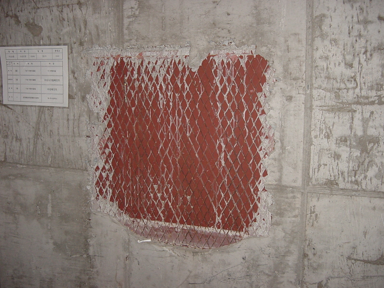 시멘트는 강재 표면에 붙지 않기 때문에 벽체에 전기박스가 매입되어 있을 때는 메탈라스 같은 철망을 대고 발라야 합니다. 메탈라스가 강재와 모르타르의 부착 성능을 높여줍니다.