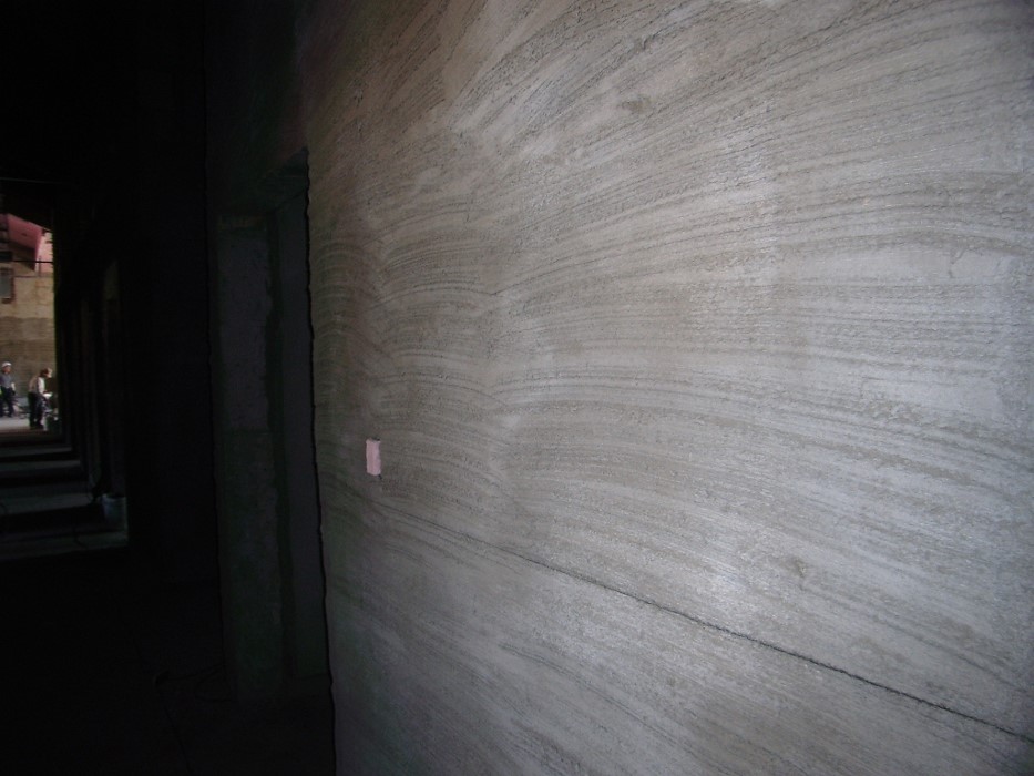 초벌을 바른 후에는 표면을 쇠빗이나 쇠갈퀴 등으로 거칠게 긁어 놓아야 합니다. 그래서 나중에 정벌 바름 모르타르가 잘 부착됩니다.